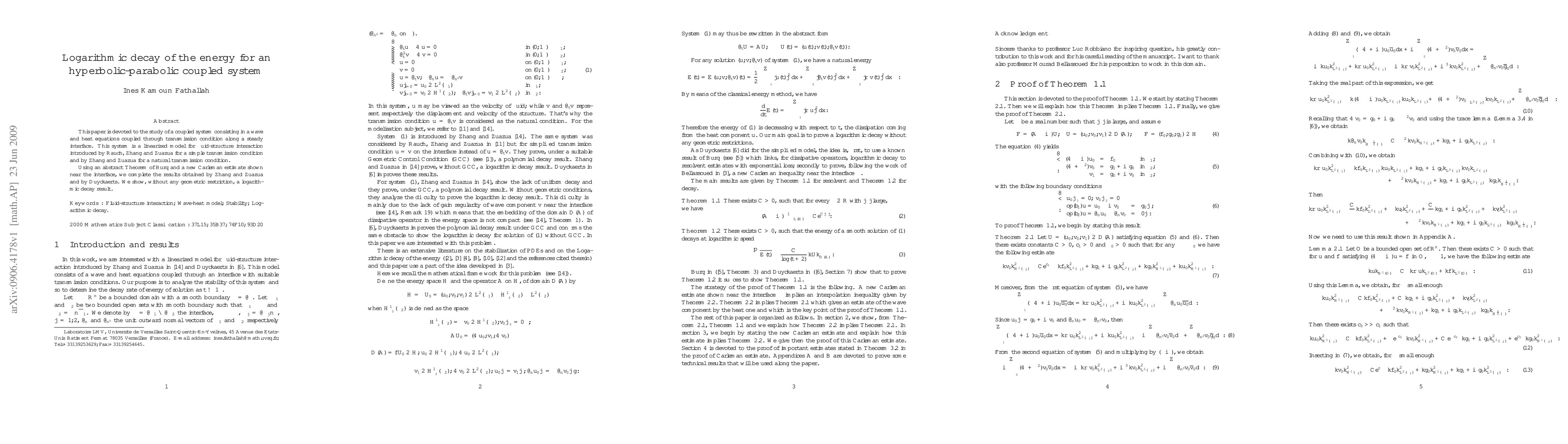 The paper introduces a new Carleman estimate and utilizes an abstract theorem to prove logarithmic energy decay for a coupled hyperbolic-parabolic system.