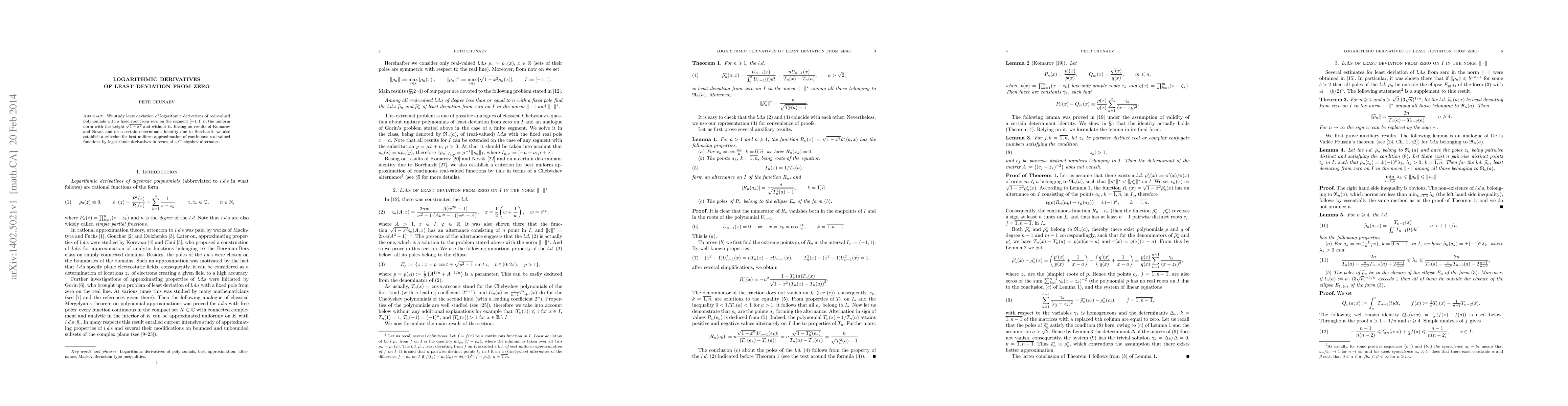This paper investigates the least deviation of logarithmic derivatives of real-valued polynomials from zero on the interval [-1,1], establishing criteria for optimal uniform approximation using Chebyshev alternation. It leverages results from Komarov and Novak and a determinant identity by Borchardt.