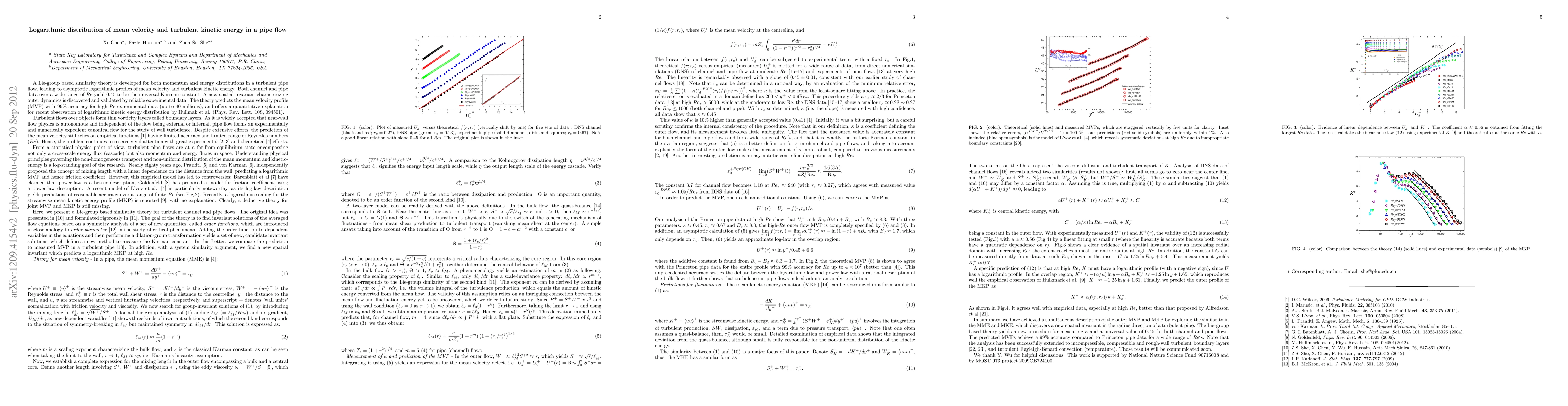 A Lie-group based similarity theory is developed for both momentum and energy distributions in a turbulent pipe flow, leading to asymptotic logarithmic profiles of mean velocity and turbulent kinetic energy. Both channel and pipe data over a wide range of Re yield 0.45 to be the universal Karman constant. A new spatial invariant characterizing outer dynamics is discovered and validated by reliable experimental data. The theory predicts the mean velocity profile (MVP) with 99% accuracy for high Re experimental data (up to 40 millions), and offers a quantitative explanation for recent observation of logarithmic kinetic energy distribution by Hullmak et al. (Phys. Rev. Lett. 108, 094501).