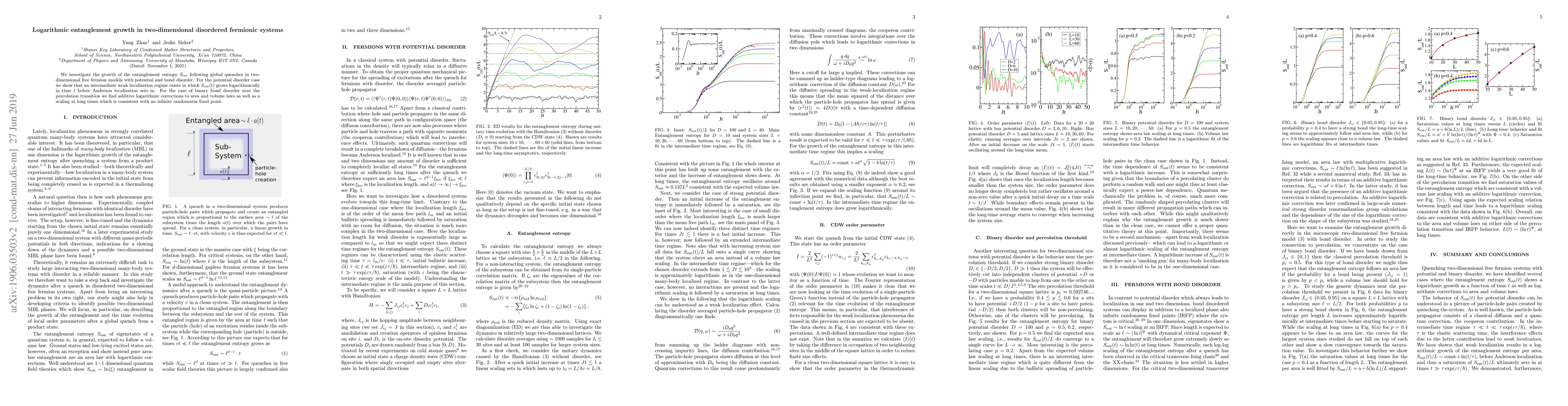 The paper presents a detailed analysis of entanglement entropy growth in 2D disordered fermionic systems, identifying distinct regimes and scaling behaviors for potential and binary bond disorders.