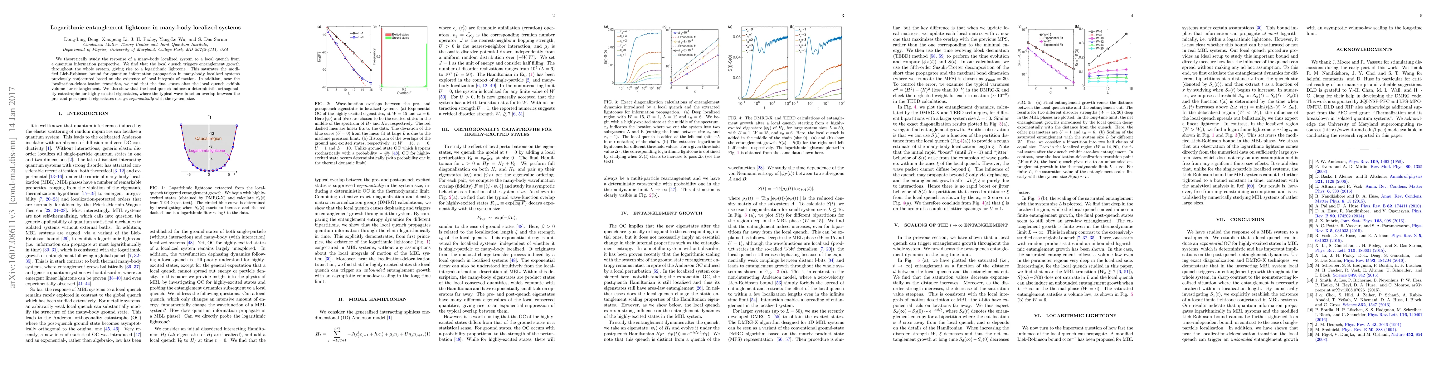 This paper explores the entanglement dynamics in many-body localized systems following a local quench, revealing a logarithmic lightcone and saturating the Lieb-Robinson bound. Near the localization-delocalization transition, it shows volume-law entanglement and an exponential decay in wave-function overlap for highly excited states post-quench.
