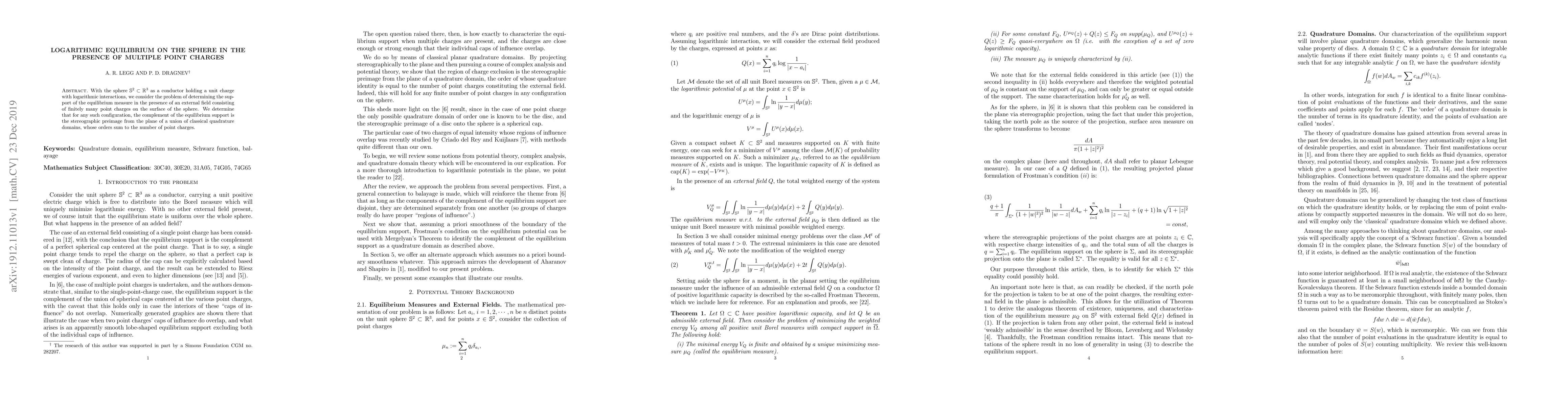 This paper investigates the equilibrium measure on a charged sphere with logarithmic interactions, determining that the complement of the equilibrium support corresponds to the stereographic projection of a union of quadrature domains, with the total order of these domains equaling the number of external point charges.