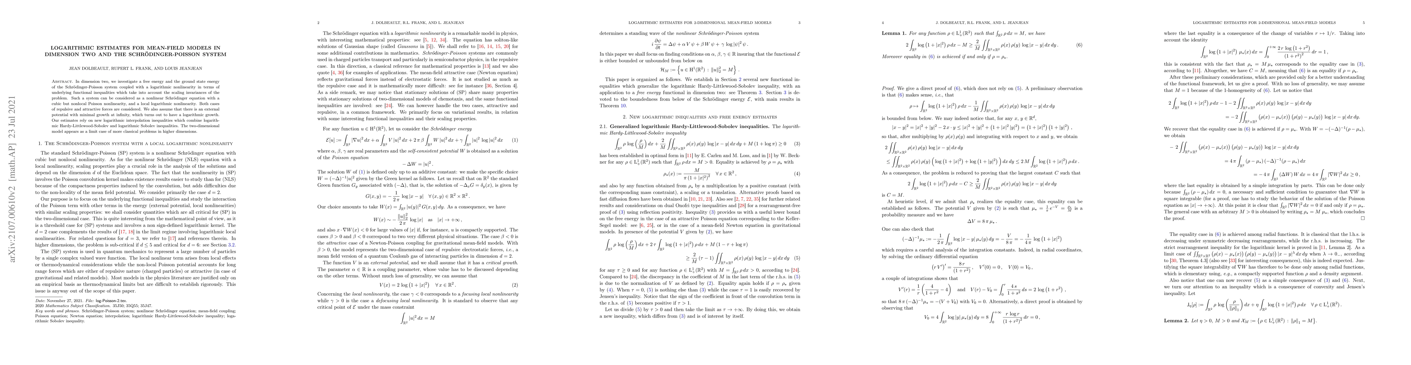 In dimension two, we investigate a free energy and the ground state energy of the Schr\"odinger-Poisson system coupled with a logarithmic nonlinearity in terms of underlying functional inequalities which take into account the scaling invariances of the problem. Such a system can be considered as a nonlinear Schr\"odinger equation with a cubic but nonlocal Poisson nonlinearity, and a local logarithmic nonlinearity. Both cases of repulsive and attractive forces are considered. We also assume that there is an external potential with minimal growth at infinity, which turns out to have a logarithmic growth. Our estimates rely on new logarithmic interpolation inequalities which combine logarithmic Hardy-Littlewood-Sobolev and logarithmic Sobolev inequalities. The two-dimensional model appears as a limit case of more classical problems in higher dimensions.