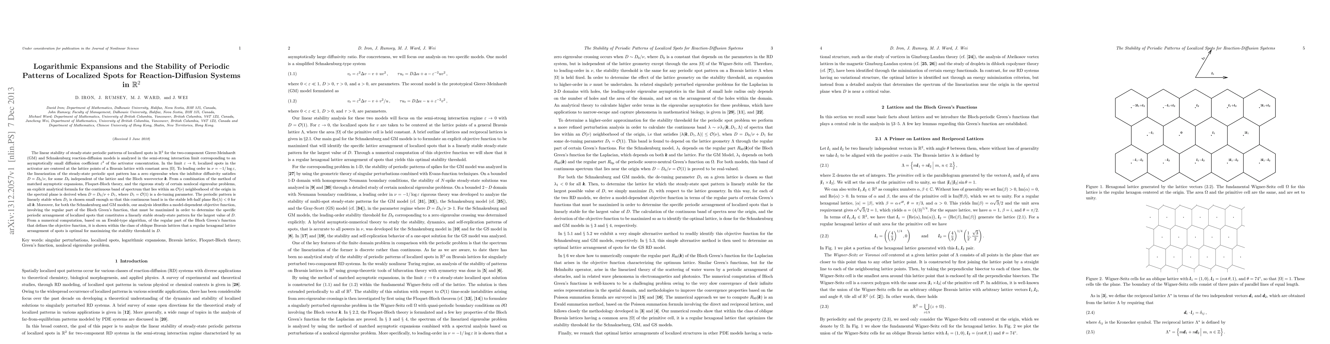 The linear stability of steady-state periodic patterns of localized spots in $\R^2$ for the two-component Gierer-Meinhardt (GM) and Schnakenburg reaction-diffusion models is analyzed in the semi-strong interaction limit corresponding to an asymptotically small diffusion coefficient $\eps^2$ of the activator concentration. In the limit $\eps\to 0$, localized spots in the activator are centered at the lattice points of a Bravais lattice with constant area $|\Omega|$. To leading order in $\nu={-1/\log\eps}$, the linearization of the steady-state periodic spot pattern has a zero eigenvalue when the inhibitor diffusivity satisfies $D={D_0/\nu}$, for some $D_0$ independent of the lattice and the Bloch wavevector $\kb$. From a combination of the method of matched asymptotic expansions, Floquet-Bloch theory, and the rigorous study of certain nonlocal eigenvalue problems, an explicit analytical formula for the continuous band of spectrum that lies within an ${\mathcal O}(\nu)$ neighborhood of the origin in the spectral plane is derived when $D={D_0/\nu} + D_1$, where $D_1={\mathcal O}(1)$ is a de-tuning parameter. The periodic pattern is linearly stable when $D_1$ is chosen small enough so that this continuous band is in the stable left-half plane $\mbox{Re}(\lambda)<0$ for all $\kb$. Moreover, for both the Schnakenburg and GM models, our analysis identifies a model-dependent objective function, involving the regular part of the Bloch Green's function, that must be maximized in order to determine the specific periodic arrangement of localized spots that constitutes a linearly stable steady-state pattern for the largest value of $D$. From a numerical computation, it is shown within the class of oblique Bravais lattices that a regular hexagonal lattice arrangement of spots is optimal for maximizing the stability threshold in $D$.