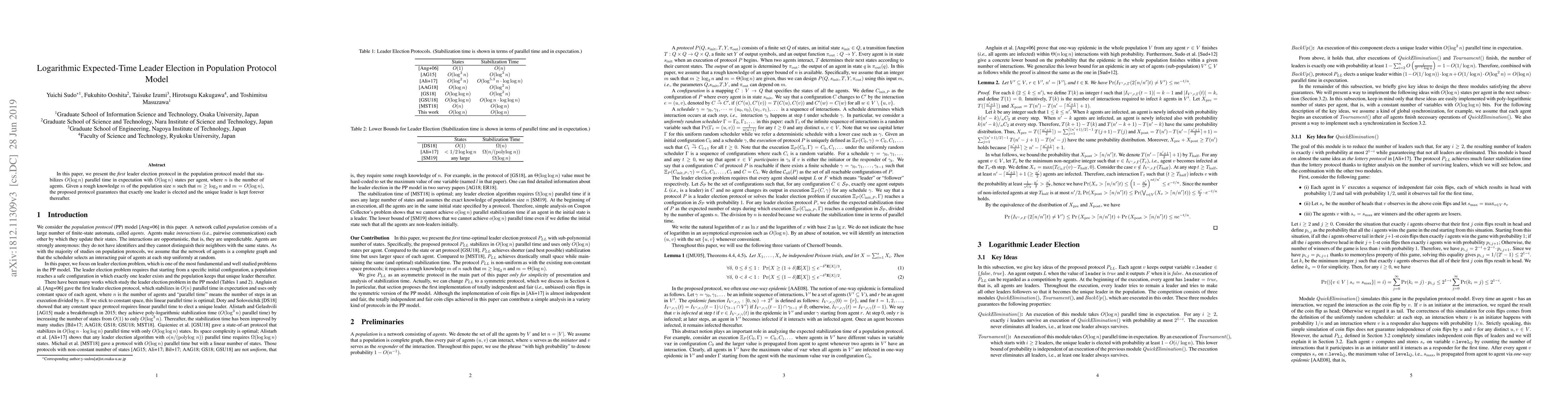 This paper presents a leader election protocol in the population protocol model that guarantees election within O(log n) parallel time in expectation, with a logarithmic stabilization time and O(log n) states per agent. The protocol requires a rough estimate of population size, ensuring exactly one leader is elected.