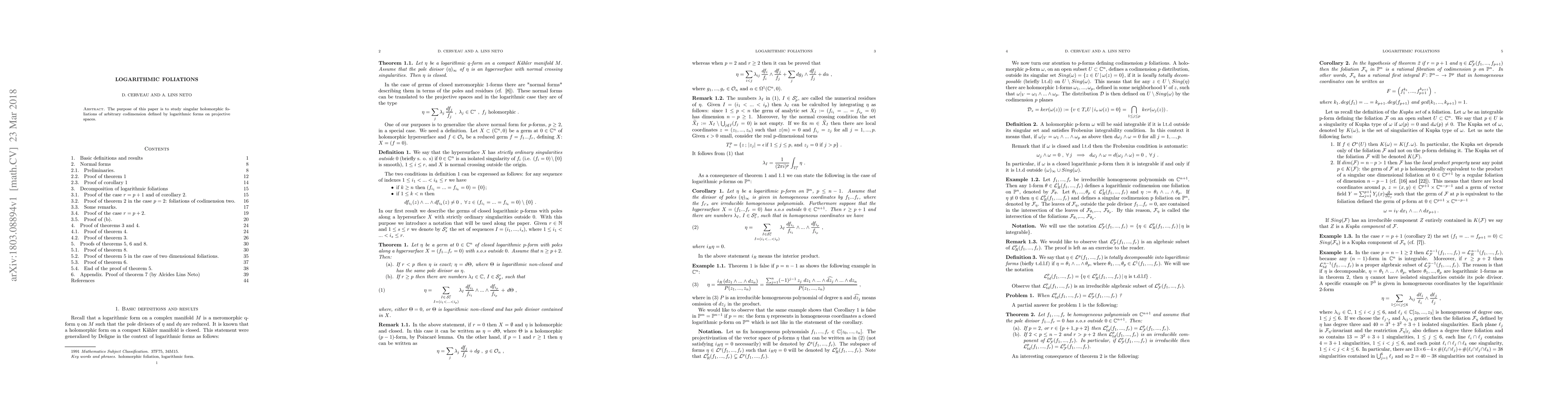 The paper employs an in-depth study of singular holomorphic foliations defined by logarithmic forms on projective spaces, focusing on codimension and their properties.