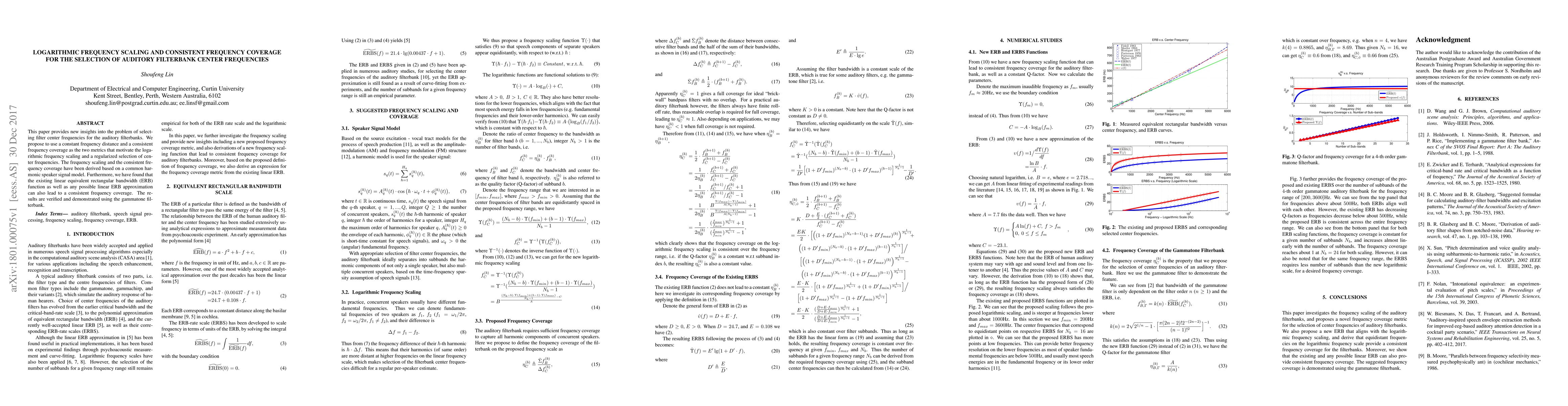 This paper provides new insights into the problem of selecting filter center frequencies for the auditory filterbanks. We propose to use a constant frequency distance and a consistent frequency coverage as the two metrics that motivate the logarithmic frequency scaling and a regularized selection of center frequencies. The frequency scaling and the consistent frequency coverage have been derived based on a common harmonic speaker signal model. Furthermore, we have found that the existing linear equivalent rectangular bandwidth (ERB) function as well as any possible linear ERB approximation can also lead to a consistent frequency coverage. The results are verified and demonstrated using the gammatone filterbank.