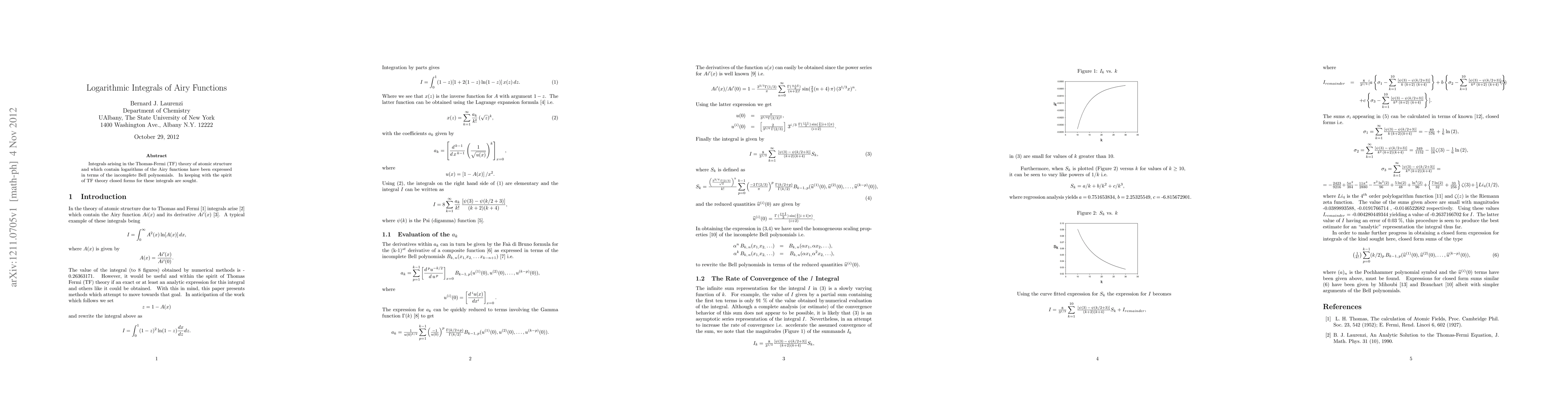 Integrals arising in the Thomas-Fermi (TF) theory of atomic structure and which contain logarithms of the Airy functions have been expressed in terms of the incomplete Bell polynomials. In keeping with the spirit of TF theory closed forms for these integrals are sought.