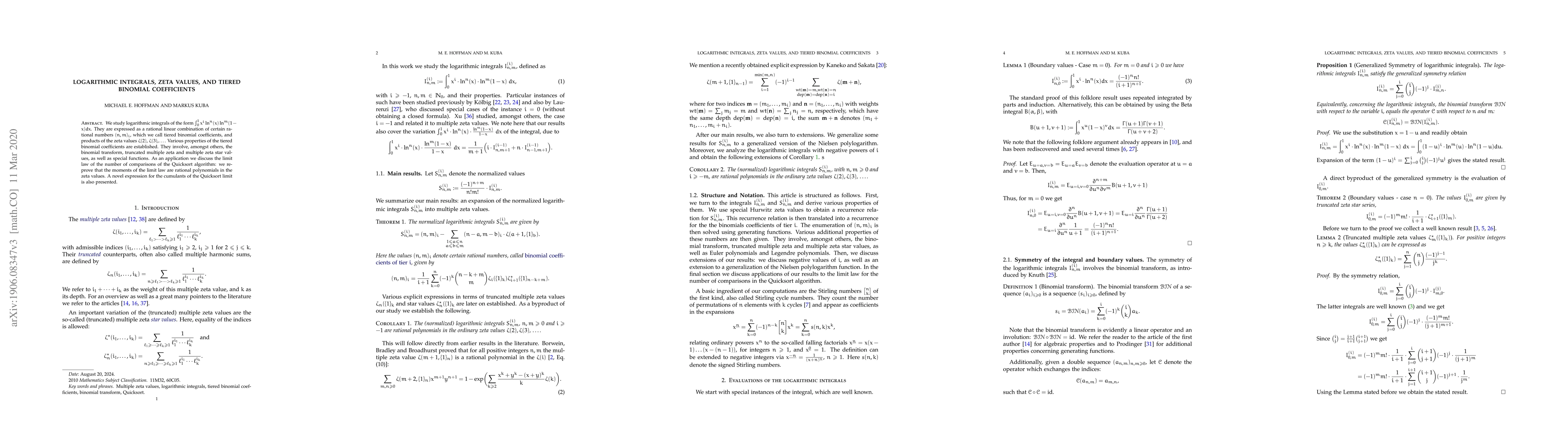 This paper explores logarithmic integrals involving powers of $\ln(x)$ and $\ln(1-x)$, expressing them as rational linear combinations of tiered binomial coefficients and products of zeta values. It establishes properties of these coefficients and applies the findings to show the moments of the Quicksort algorithm's limit law are rational polynomials in zeta values, with a new expression for the cumulants.