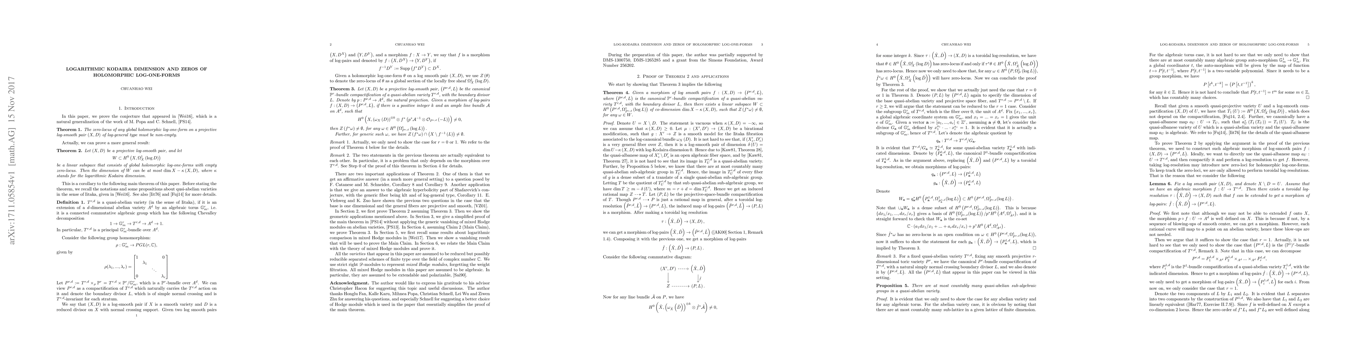 Summary: The paper proves that global holomorphic log-one-forms on log-smooth pairs of log-general type must have non-empty zero-loci, thereby supporting the algebraic hyperbolicity part of Shafarevich's conjecture for Kawamata-log-terminal fibers of log-general type.