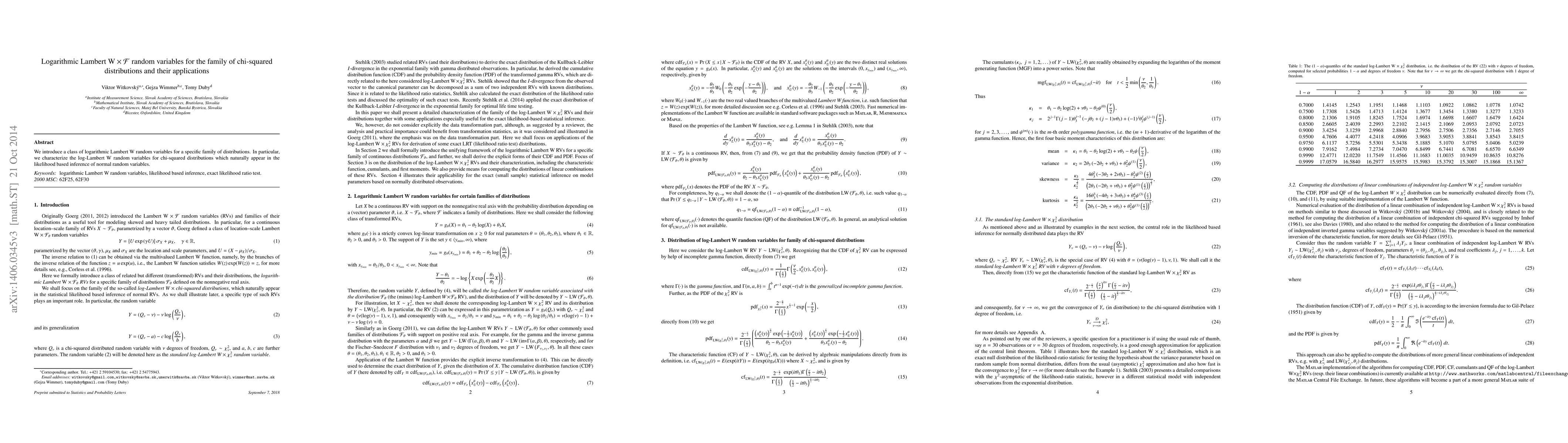 Summary: This paper introduces logarithmic Lambert W random variables for chi-squared distributions, which are useful in likelihood-based inference of normal random variables, providing a new framework for statistical analysis. The characterization of these variables enhances the understanding of their applications in probabilistic modeling.