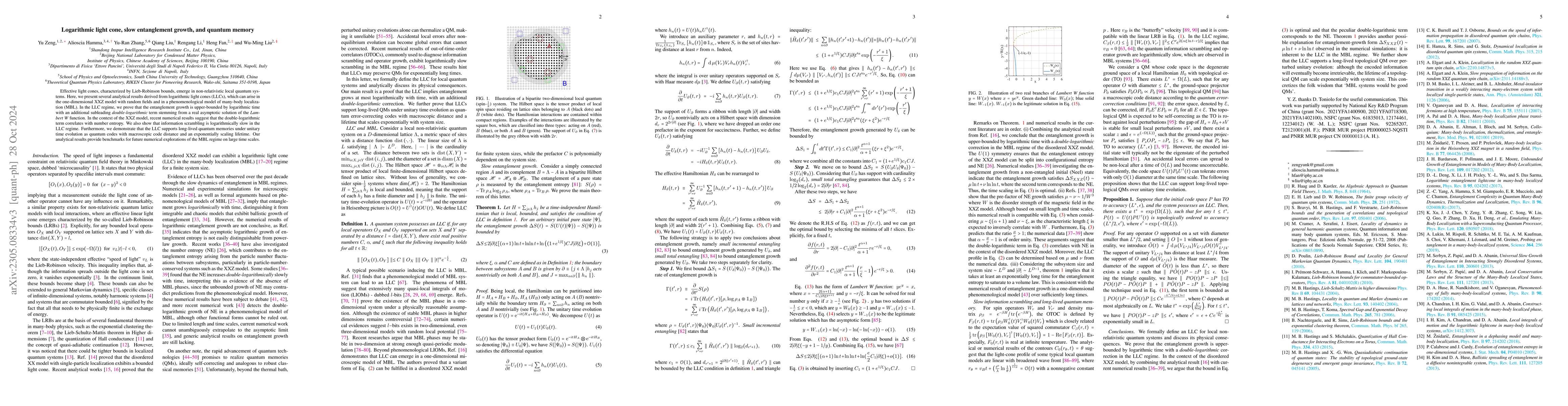 This paper explores the emergence of a logarithmic light cone (LLC) in non-relativistic quantum systems, demonstrating its implications for slow entanglement growth and information scrambling. The LLC supports long-lived quantum memory, providing a quantum code with macroscopic code distance and exponentially long lifetime.