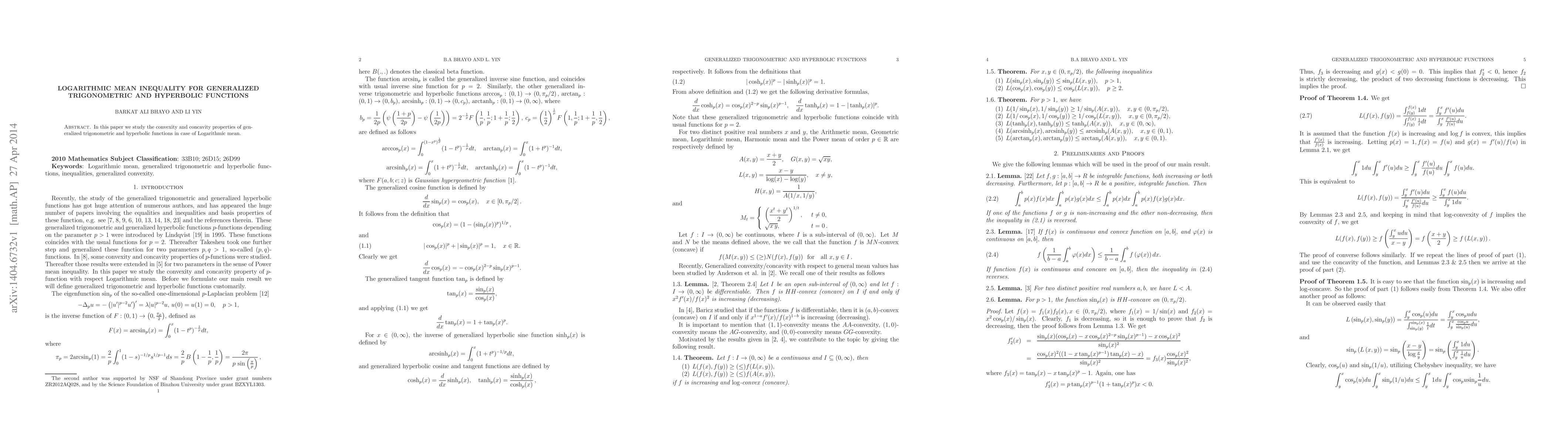 Summary: This paper investigates the convexity and concavity properties of generalized trigonometric and hyperbolic functions through the lens of the logarithmic mean, establishing a logarithmic mean inequality for these functions.