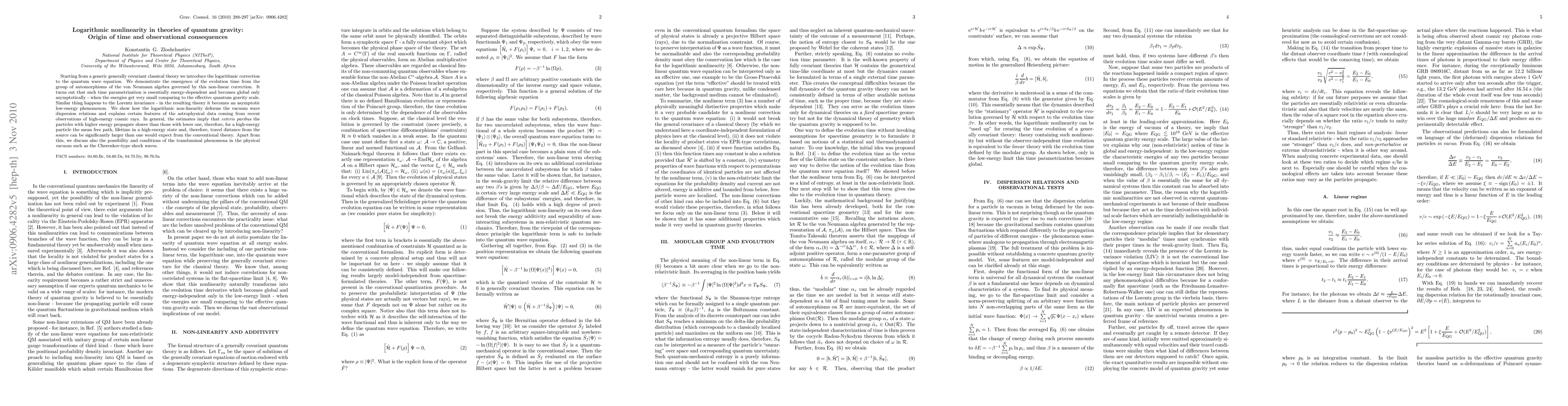 Starting from a generic generally covariant classical theory we introduce the logarithmic correction to the quantum wave equation. We demonstrate the emergence of the evolution time from the group of automorphisms of the von Neumann algebra governed by this non-linear correction. It turns out that such time parametrization is essentially energy-dependent and becomes global only asymptotically - when the energies get very small comparing to the effective quantum gravity scale. Similar thing happens to the Lorentz invariance - in the resulting theory it becomes an asymptotic low-energy phenomenon. We show how the logarithmic non-linearity deforms the vacuum wave dispersion relations and explains certain features of the astrophysical data coming from recent observations of high-energy cosmic rays. In general, the estimates imply that ceteris paribus the particles with higher energy propagate slower than those with lower one, therefore, for a high-energy particle the mean free path, lifetime in a high-energy state and, therefore, travel distance from the source can be significantly larger than one would expect from the conventional theory. Apart from this, we discuss also the possibility and conditions of the transluminal phenomena in the physical vacuum such as the Cherenkov-type shock waves.