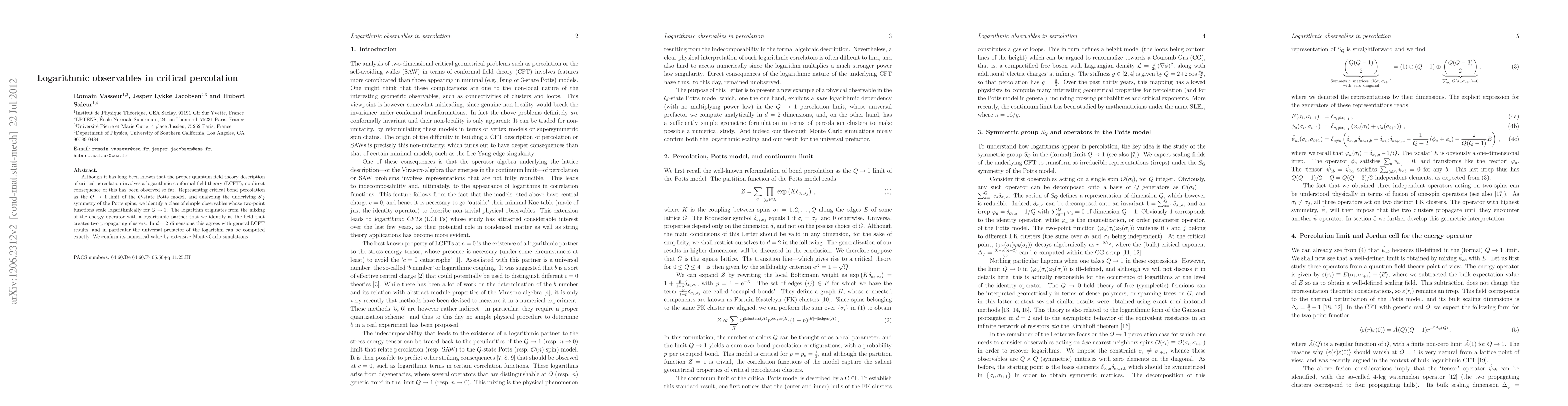 Researchers identify a class of observables in critical percolation that scale logarithmically, aligning with general results from conformal field theory, and confirm their numerical value through Monte-Carlo simulations.
