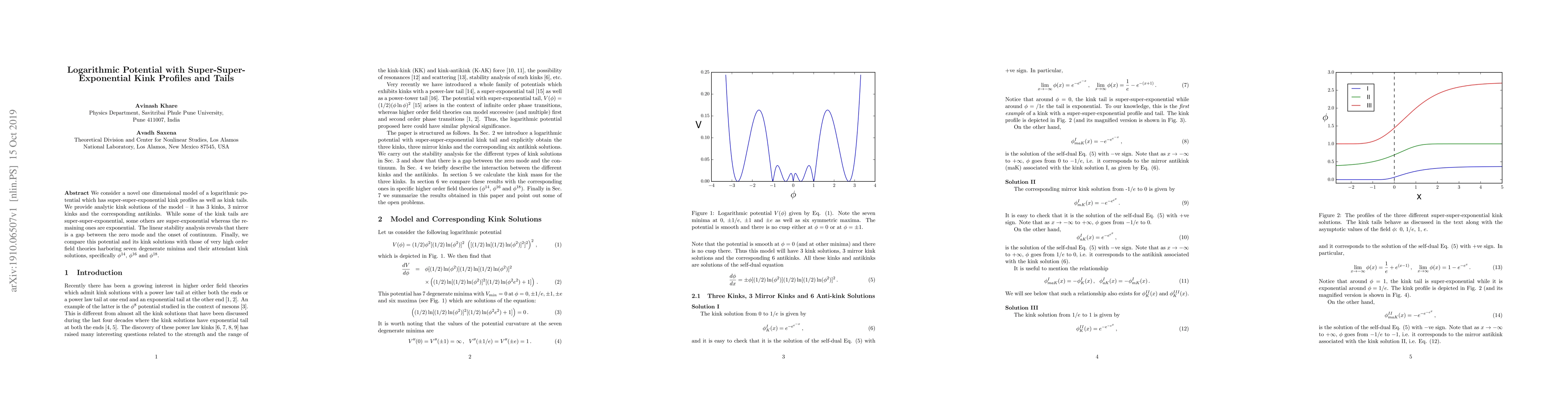 The paper introduces a novel one-dimensional model of a logarithmic potential with super-super-exponential kink profiles and tails, providing analytic kink solutions including 3 kinks, 3 mirror kinks, and their corresponding antikinks.