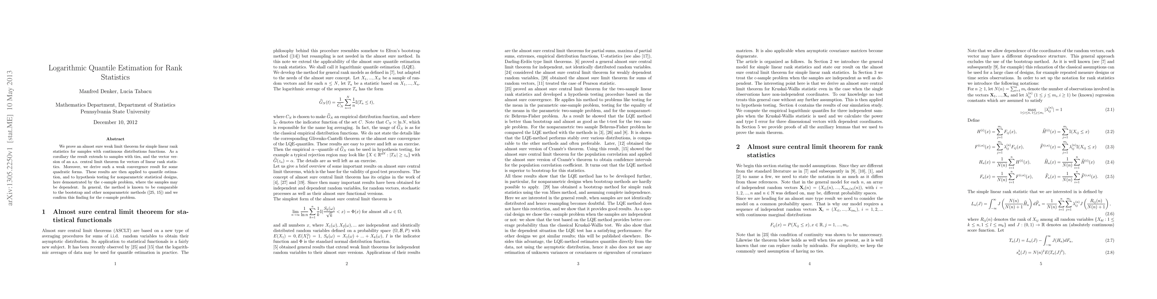 This paper establishes a logarithmic quantile estimation method for rank statistics, proving an almost sure weak limit theorem for linear rank statistics with continuous distribution functions, extending to samples with ties. The method is also applicable to hypothesis testing in nonparametric designs, particularly in the c-sample problem with dependent samples, and is shown to be comparable to the bootstrap method.