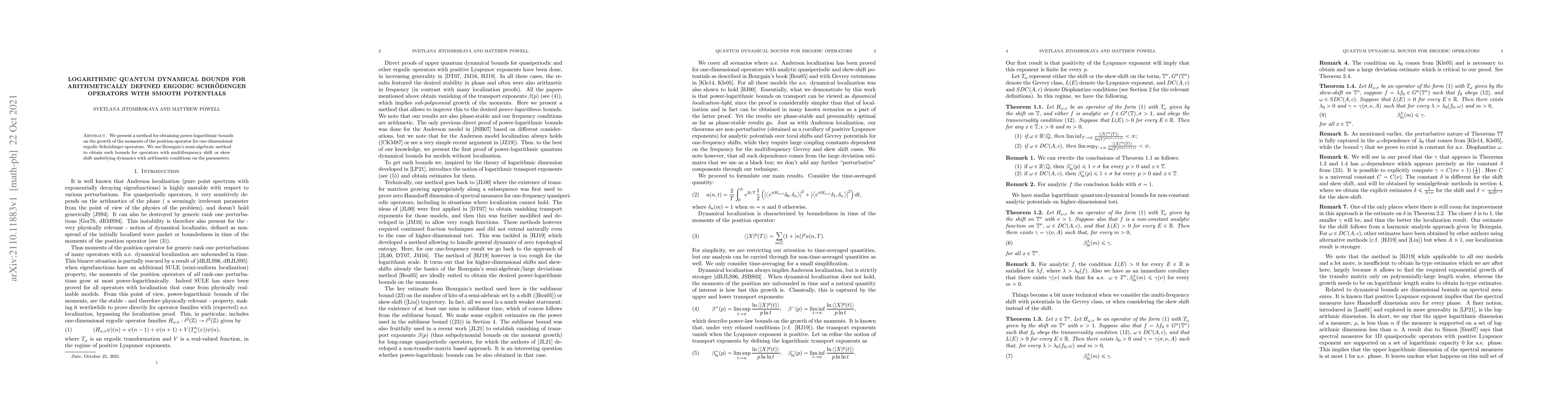 This paper introduces a method to derive power-logarithmic bounds on the growth of moments of position operators for one-dimensional ergodic Schr"odinger operators with smooth potentials.