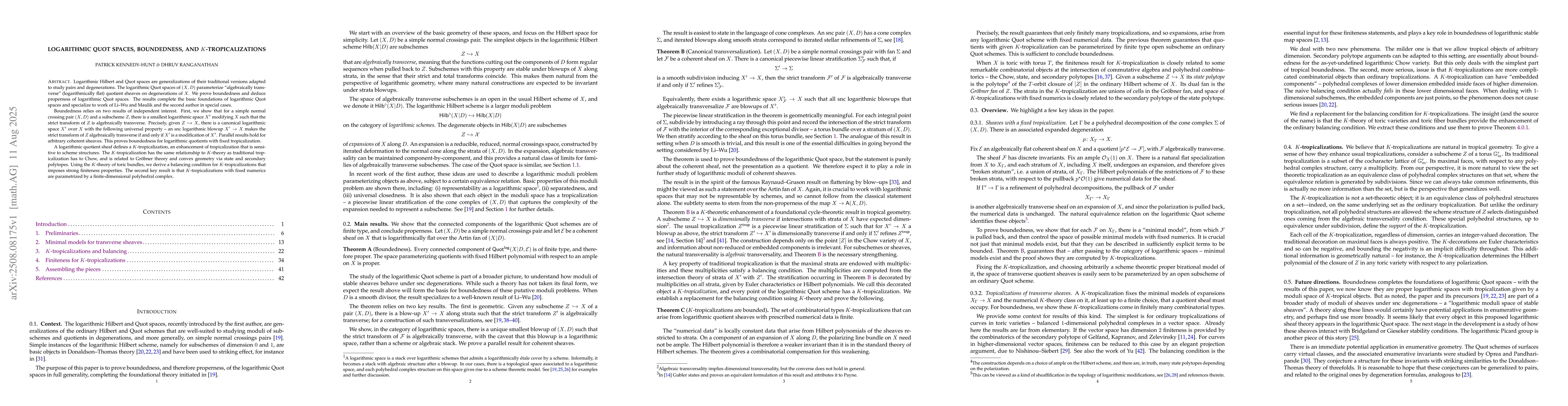 Logarithmic Hilbert and Quot spaces are generalizations of their traditional versions adapted to study pairs and degenerations. The logarithmic Quot spaces of $(X,D)$ parameterize "algebraically transverse" (logarithmically flat) quotient sheaves on degenerations of $X$. We prove boundedness and deduce properness of logarithmic Quot spaces. The results complete the basic foundations of logarithmic Quot spaces and specialize to work of Li-Wu and Maulik and the second author in special cases. Boundedness relies on two results of independent interest. First, we show that for a simple normal crossing pair $(X, D)$ and a subscheme $Z$, there is a smallest logarithmic space ${X}^\flat$ modifying $X$ such that the strict transform of $Z$ is algebraically transverse. Precisely, given $Z$ in $X$, there is a canonical logarithmic space $X^\flat$ over $X$ with the following universal property - an snc logarithmic blowup $X'\to X$ makes the strict transform of $Z$ algebraically transverse if and only if $X'$ is a modification of $X^\flat$. Parallel results hold for arbitrary coherent sheaves. This proves boundedness for logarithmic quotients with fixed tropicalization. A logarithmic quotient sheaf defines a K-tropicalization, an enhancement of tropicalization that is sensitive to scheme structures. The K-tropicalization has the same relationship to K-theory as traditional tropicalization has to Chow, and is related to Gr\"obner theory and convex geometry via state and secondary polytopes. Using the K-theory of toric bundles, we derive a balancing condition for K-tropicalizations that imposes strong finiteness properties. The second key result is that K-tropicalizations with fixed numerics are parametrized by a finite-dimensional polyhedral complex.