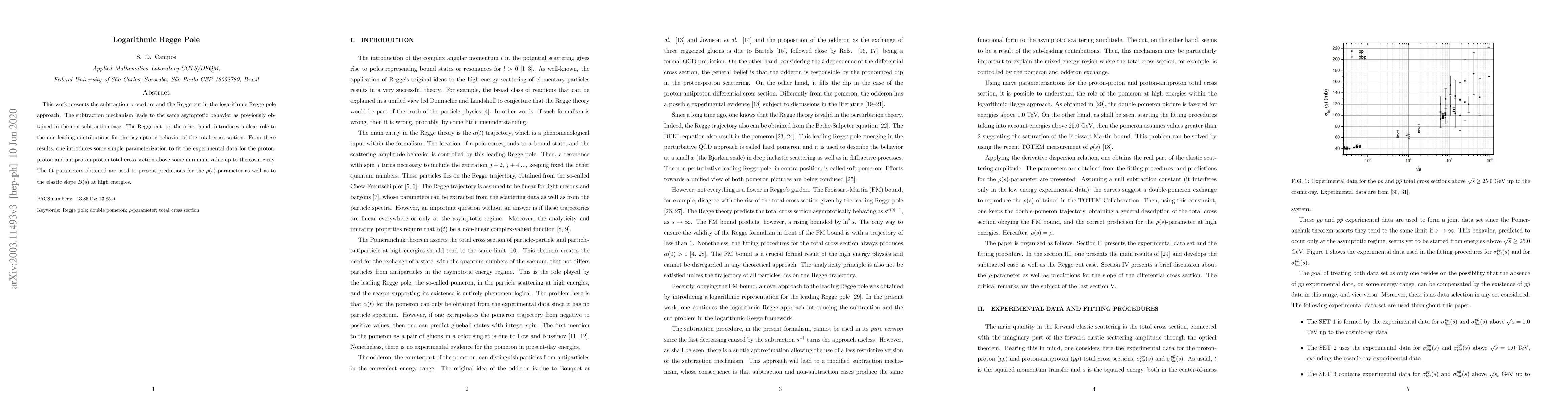 This work presents the subtraction procedure and the Regge cut in the logarithmic Regge pole approach. The subtraction mechanism leads to the same asymptotic behavior as previously obtained in the non-subtraction case. The Regge cut, on the other hand, introduces a clear role to the non-leading contributions for the asymptotic behavior of the total cross section. From these results, one introduces some simple parameterization to fit the experimental data for the proton-proton and antiproton-proton total cross section above some minimum value up to the cosmic-ray. The fit parameters obtained are used to present predictions for the $\rho(s)$-parameter as well as to the elastic slope $B(s)$ at high energies.