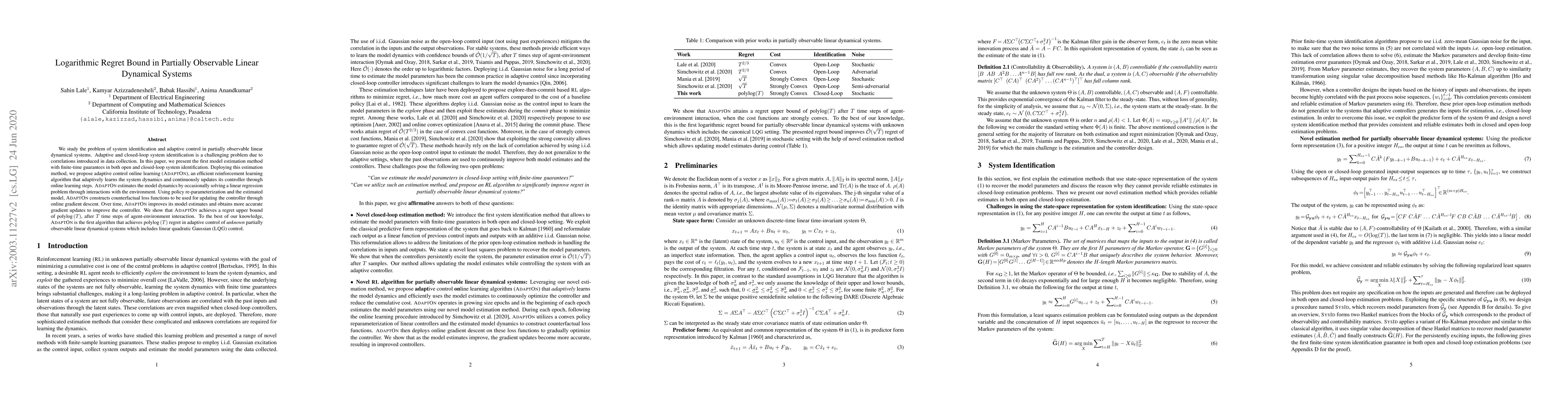 We study the problem of system identification and adaptive control in partially observable linear dynamical systems. Adaptive and closed-loop system identification is a challenging problem due to correlations introduced in data collection. In this paper, we present the first model estimation method with finite-time guarantees in both open and closed-loop system identification. Deploying this estimation method, we propose adaptive control online learning (AdaptOn), an efficient reinforcement learning algorithm that adaptively learns the system dynamics and continuously updates its controller through online learning steps. AdaptOn estimates the model dynamics by occasionally solving a linear regression problem through interactions with the environment. Using policy re-parameterization and the estimated model, AdaptOn constructs counterfactual loss functions to be used for updating the controller through online gradient descent. Over time, AdaptOn improves its model estimates and obtains more accurate gradient updates to improve the controller. We show that AdaptOn achieves a regret upper bound of $\text{polylog}\left(T\right)$, after $T$ time steps of agent-environment interaction. To the best of our knowledge, AdaptOn is the first algorithm that achieves $\text{polylog}\left(T\right)$ regret in adaptive control of unknown partially observable linear dynamical systems which includes linear quadratic Gaussian (LQG) control.