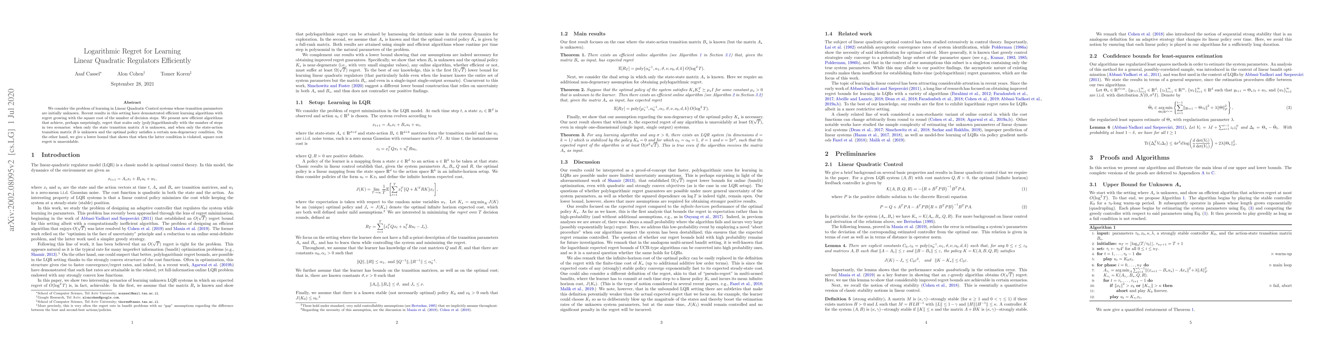 This paper presents efficient algorithms for learning Linear Quadratic Regulators with unknown transition parameters, achieving logarithmic regret in certain scenarios, while also providing a lower bound demonstrating that square root regret is necessary when the optimal policy does not satisfy a non-degeneracy condition.
