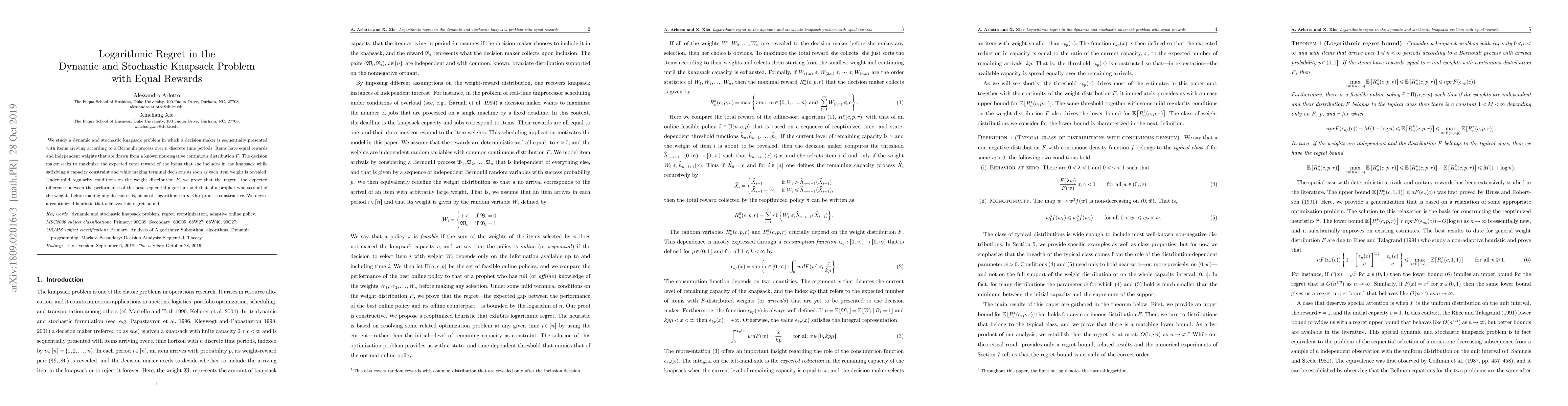 This research presents a solution for the dynamic and stochastic knapsack problem with equal rewards, proving that a logarithmic regret is achievable under mild conditions on the weight distribution. A constructive proof is given, introducing a reoptimized heuristic that meets this regret bound.