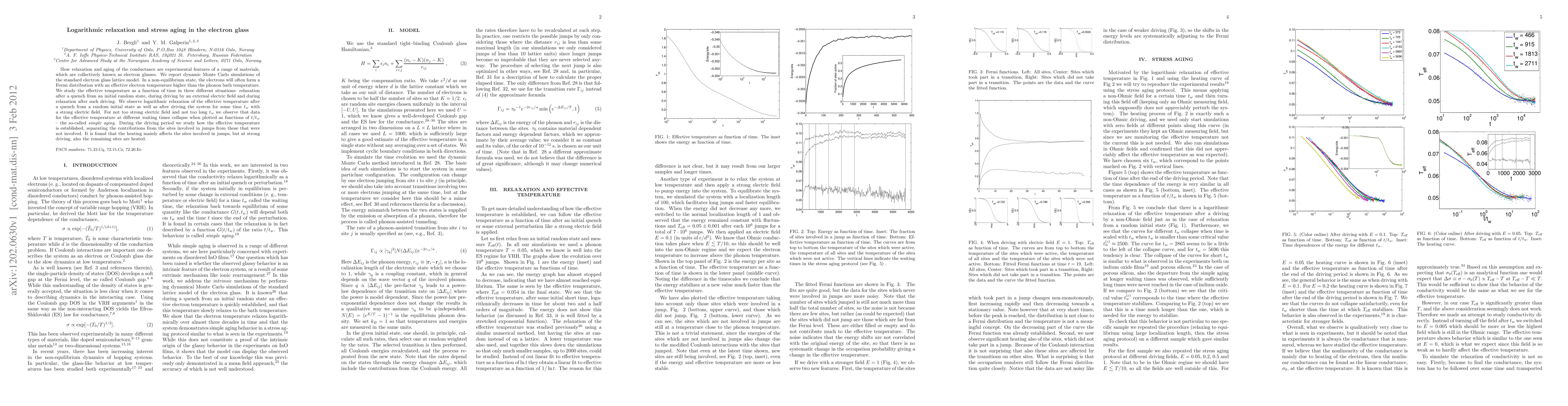 Slow relaxation and aging of the conductance are experimental features of a range of materials, which are collectively known as electron glasses. We report dynamic Monte Carlo simulations of the standard electron glass lattice model. In a non-equilibrium state, the electrons will often form a Fermi distribution with an effective electron temperature higher than the phonon bath temperature. We study the effective temperature as a function of time in three different situations: relaxation after a quench from an initial random state, during driving by an external electric field and during relaxation after such driving. We observe logarithmic relaxation of the effective temperature after a quench from a random initial state as well as after driving the system for some time $t_w$ with a strong electric field. For not too strong electric field and not too long $t_w$ we observe that data for the effective temperature at different waiting times collapse when plotted as functions of $t/t_w$ -- the so-called simple aging. During the driving period we study how the effective temperature is established, separating the contributions from the sites involved in jumps from those that were not involved. It is found that the heating mainly affects the sites involved in jumps, but at strong driving, also the remaining sites are heated.
