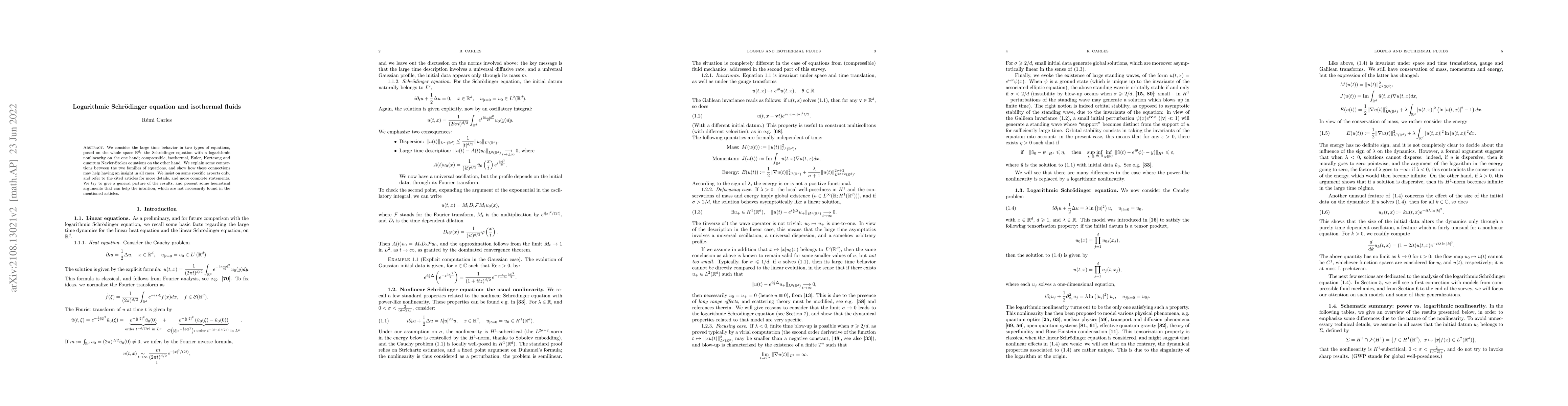 We consider the large time behavior in two types of equations, posed on the whole space R^d: the Schr{\"o}dinger equation with a logarithmic nonlinearity on the one hand; compressible, isothermal, Euler, Korteweg and quantum Navier-Stokes equations on the other hand. We explain some connections between the two families of equations, and show how these connections may help having an insight in all cases. We insist on some specific aspects only, and refer to the cited articles for more details, and more complete statements. We try to give a general picture of the results, and present some heuristical arguments that can help the intuition, which are not necessarily found in the mentioned articles.