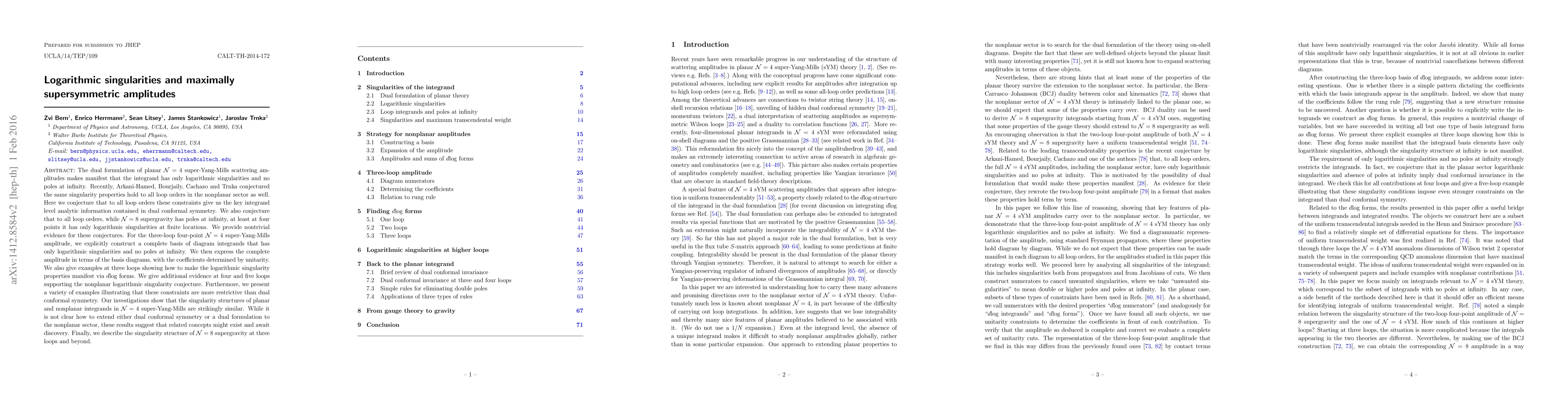 The dual formulation of planar N = 4 super-Yang-Mills scattering amplitudes makes manifest that the integrand has only logarithmic singularities and no poles at infinity. Recently, Arkani-Hamed, Bourjaily, Cachazo and Trnka conjectured the same singularity properties hold to all loop orders in the nonplanar sector as well. Here we conjecture that to all loop orders these constraints give us the key analytic information contained in dual conformal symmetry. We also conjecture that to all loop orders, while N = 8 supergravity has poles at infinity, at least at four points it has only logarithmic singularities at finite locations. We provide nontrivial evidence for these conjectures. For the three-loop four-point N = 4 super-Yang-Mills amplitude, we explicitly construct a complete basis of diagram integrands that has only logarithmic singularities and no poles at infinity. We then express the complete amplitude in terms of the basis diagrams, with the coefficients determined by unitarity. We also give examples at three loops showing how to make the logarithmic singularity properties manifest via dlog forms. We give additional evidence at four and five loops supporting the nonplanar logarithmic singularity conjecture. Furthermore, we present a variety of examples illustrating that these constraints are more restrictive than dual conformal symmetry. Our investigations show that the singularity structures of planar and nonplanar amplitudes in N = 4 super-Yang-Mills are strikingly similar. While it is not clear how to extend either dual conformal symmetry or a dual formulation to the nonplanar sector, these results suggest that related concepts might exist and await discovery. Finally, we describe the singularity structure of N = 8 supergravity at three loops and beyond.