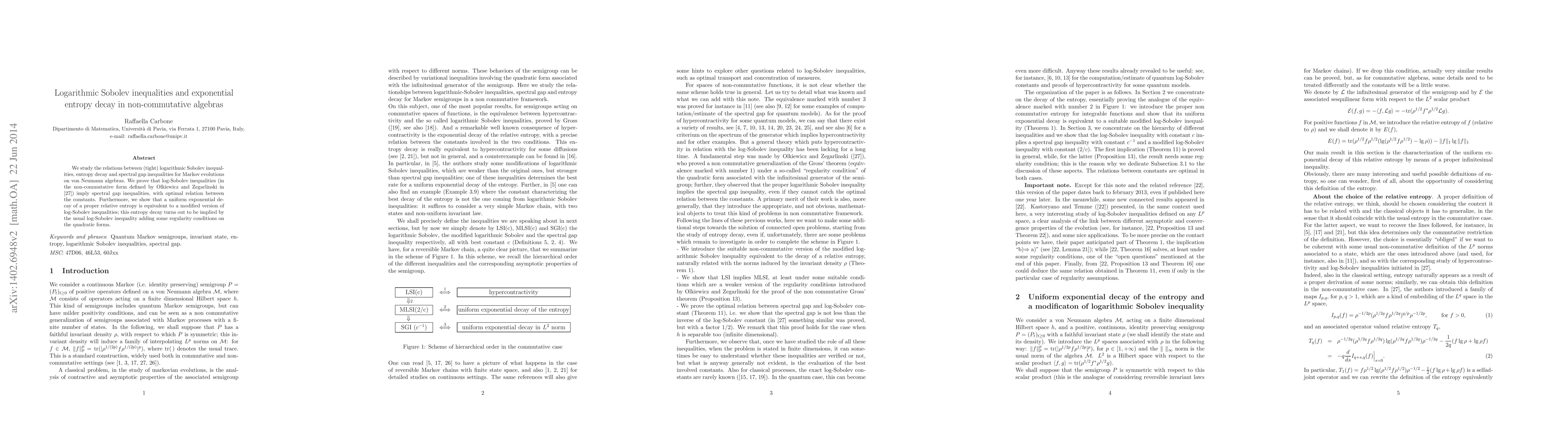 This paper explores the connections between logarithmic Sobolev inequalities, entropy decay, and spectral gap inequalities in non-commutative algebras, proving that log-Sobolev inequalities imply spectral gap inequalities with optimal constant relations. It also demonstrates that uniform exponential decay of relative entropy is equivalent to a modified log-Sobolev inequality, which is itself implied by the standard log-Sobolev inequality under certain regularity conditions.