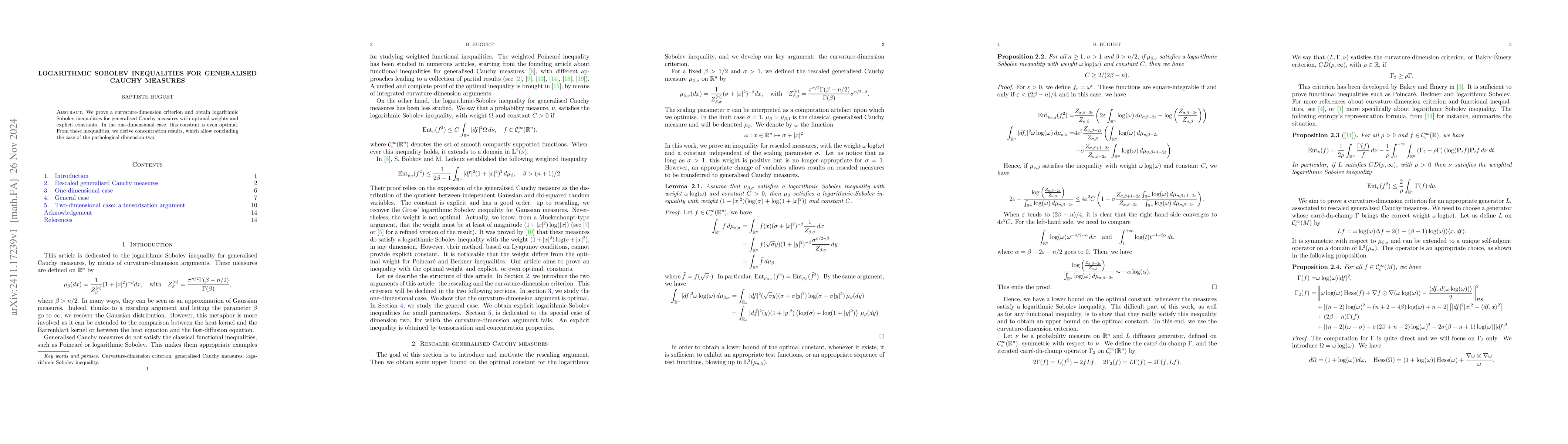 This paper proves a curvature-dimension criterion and establishes logarithmic Sobolev inequalities for generalised Cauchy measures, providing optimal weights and explicit constants. These inequalities lead to concentration results, particularly resolving cases in pathological dimension two.