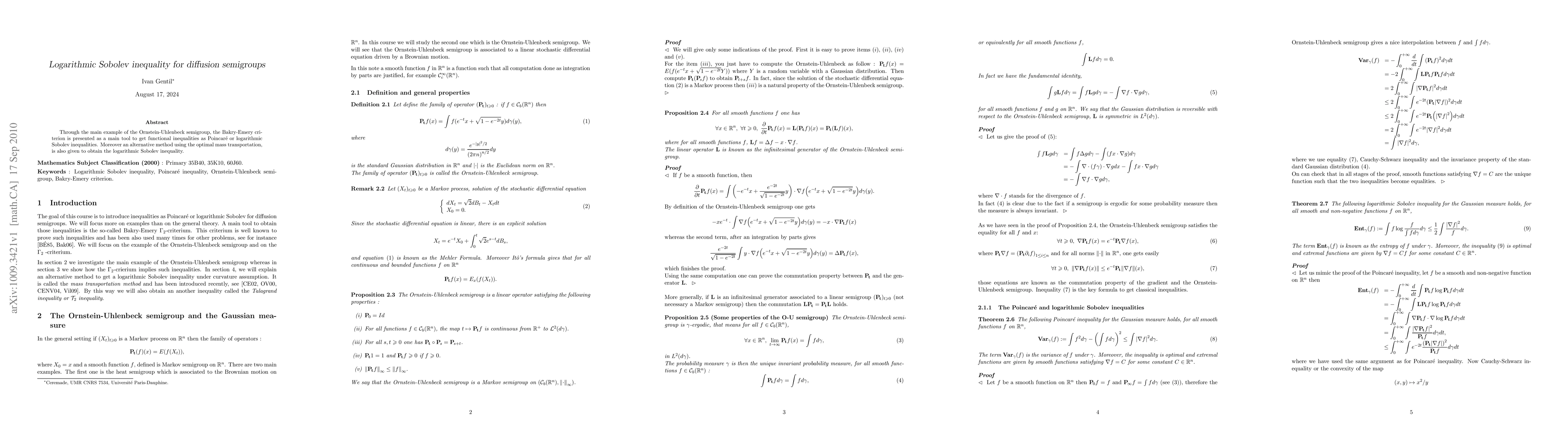 This paper utilizes the Bakry-Emery criterion and optimal mass transportation to derive the logarithmic Sobolev inequality for the Ornstein-Uhlenbeck semigroup, illustrating both a classical and an alternative method for obtaining such functional inequalities.
