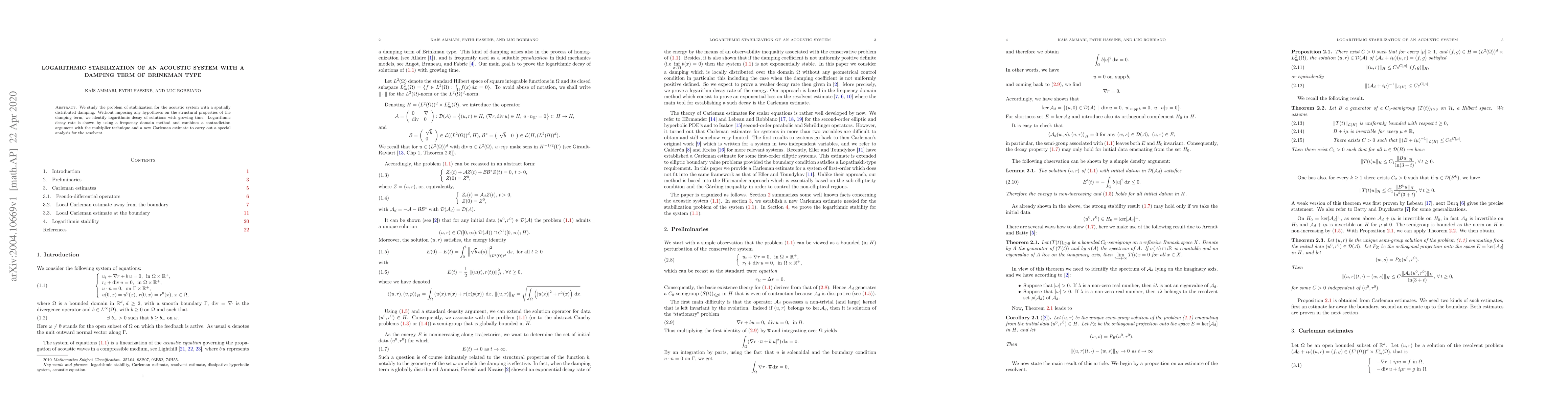 This research paper investigates the stabilization of an acoustic system with a Brinkman type damping term, finding that solutions exhibit logarithmic decay over time without imposing structural properties on the damping term.