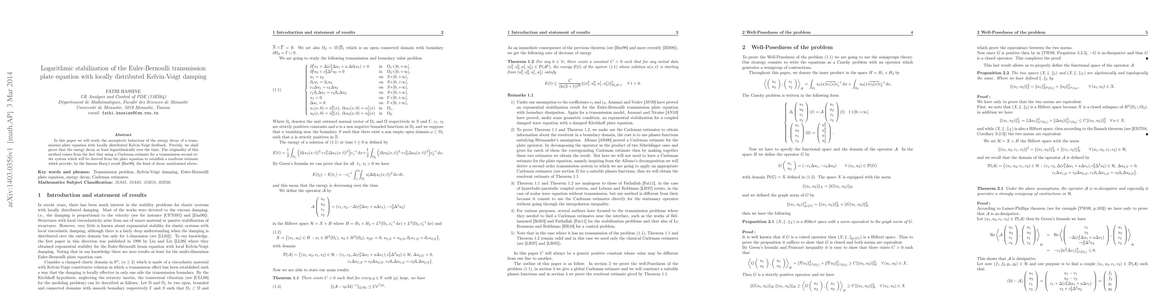 In this paper we will study the asymptotic behaviour of the energy decay of a transmission plate equation with locally distributed Kelvin-Voigt feedback. Precisly, we shall prove that the energy decay at least logarithmically over the time. The originality of this method comes from the fact that using a Carleman estimate for a transmission second order system which will be derived from the plate equation to establish a resolvent estimate which provide, by the famous Burq's result [Bur98], the kind of decay mentionned above.
