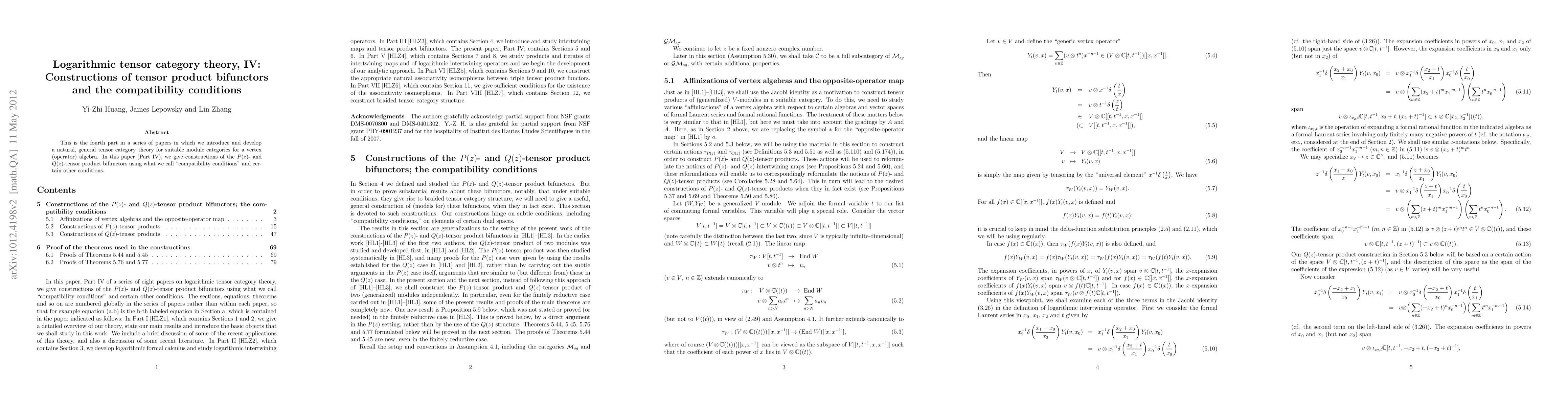 This is the fourth part in a series of papers in which we introduce and develop a natural, general tensor category theory for suitable module categories for a vertex (operator) algebra. In this paper (Part IV), we give constructions of the P(z)- and Q(z)-tensor product bifunctors using what we call "compatibility conditions" and certain other conditions.
