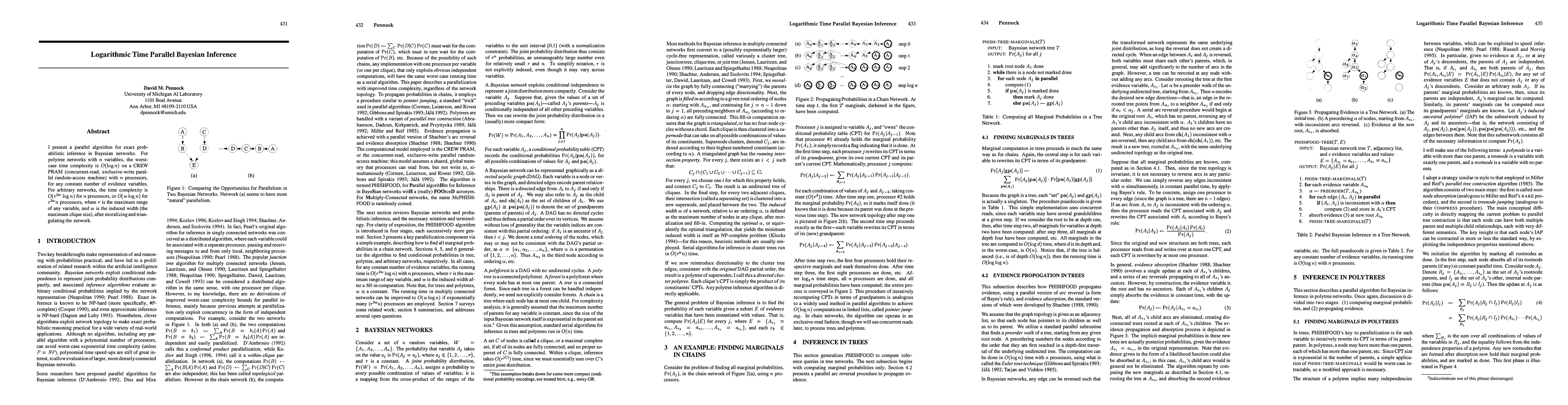 This paper introduces a parallel algorithm for exact Bayesian inference in Bayesian networks, achieving O(log n) time complexity for polytree networks on a CREW PRAM with n processors. For arbitrary networks, the algorithm scales to O(r^{3w}*log n) for n processors or O(w*log n) for r^{3w}*n processors, after moralizing and triangulating the network.