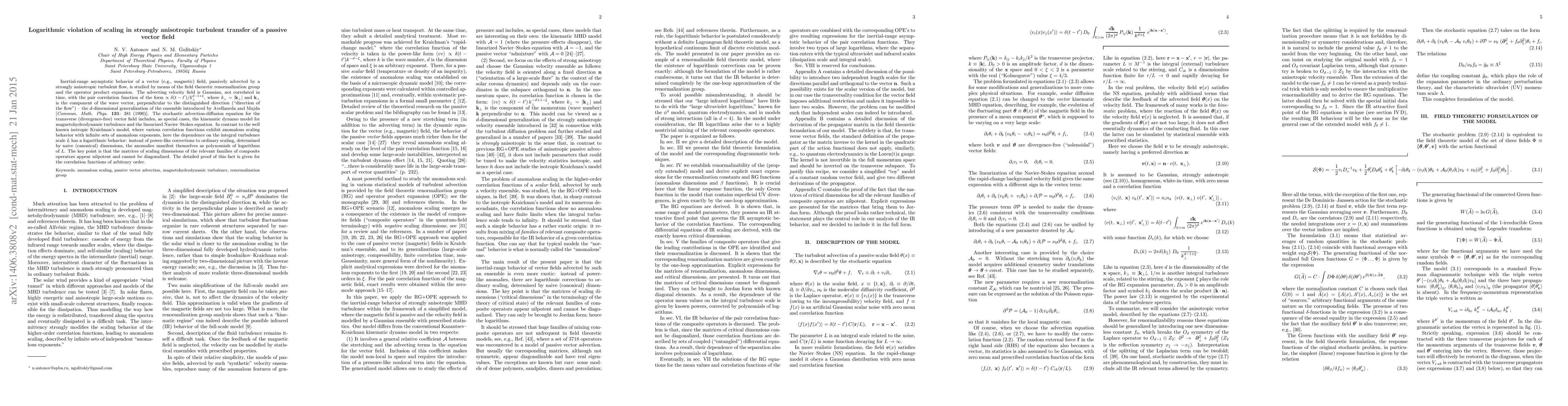 Inertial-range asymptotic behavior of a vector (e.g., magnetic) field, passively advected by a strongly anisotropic turbulent flow, is studied by means of the field theoretic renormalization group and the operator product expansion. The advecting velocity field is Gaussian, not correlated in time, with the pair correlation function of the form $\propto \delta(t-t') / k_{\bot}^{d-1+\xi}$, where $k_{\bot}=|{\bf k}_{\bot}|$ and ${\bf k}_{\bot}$ is the component of the wave vector, perpendicular to the distinguished direction (`direction of the flow') -- the $d$-dimensional generalization of the ensemble introduced by Avellaneda and Majda [{\it Commun. Math. Phys.} {\bf 131}: 381 (1990)]. The stochastic advection-diffusion equation for the transverse (divergence-free) vector field includes, as special cases, the kinematic dynamo model for magnetohydrodynamic turbulence and the linearized Navier--Stokes equation. In contrast to the well known isotropic Kraichnan's model, where various correlation functions exhibit anomalous scaling behavior with infinite sets of anomalous exponents, here the dependence on the integral turbulence scale $L$ has a logarithmic behavior: instead of power-like corrections to ordinary scaling, determined by naive (canonical) dimensions, the anomalies manifest themselves as polynomials of logarithms of $L$. The key point is that the matrices of scaling dimensions of the relevant families of composite operators appear nilpotent and cannot be diagonalized. The detailed proof of this fact is given for correlation functions of arbitrary order.