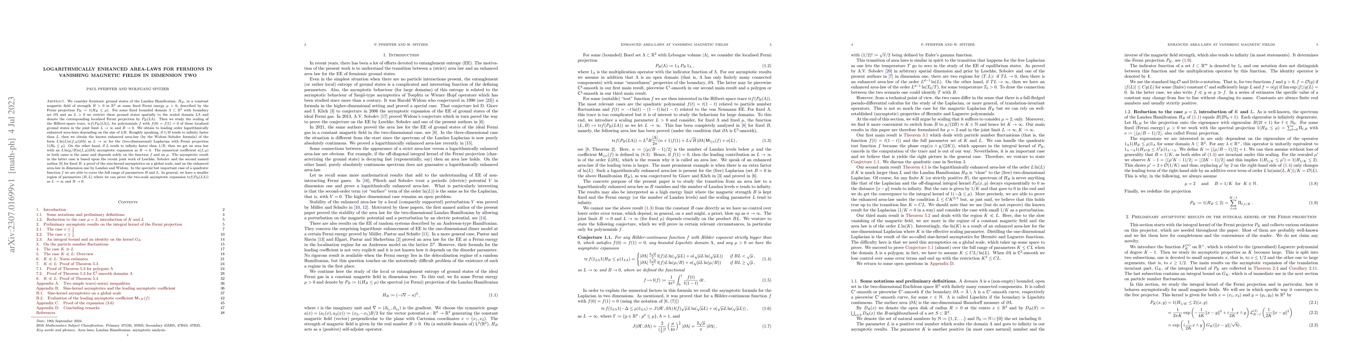 This paper investigates fermionic ground states in a vanishing magnetic field in two dimensions, deriving logarithmically enhanced area-laws for the Hilbert-space trace of localised Fermi projections. The study reveals distinct scaling behaviors depending on the relative rates of $L$ and $1/B$ tending to infinity, with numerical coefficients dependent on the function and Fermi energy.