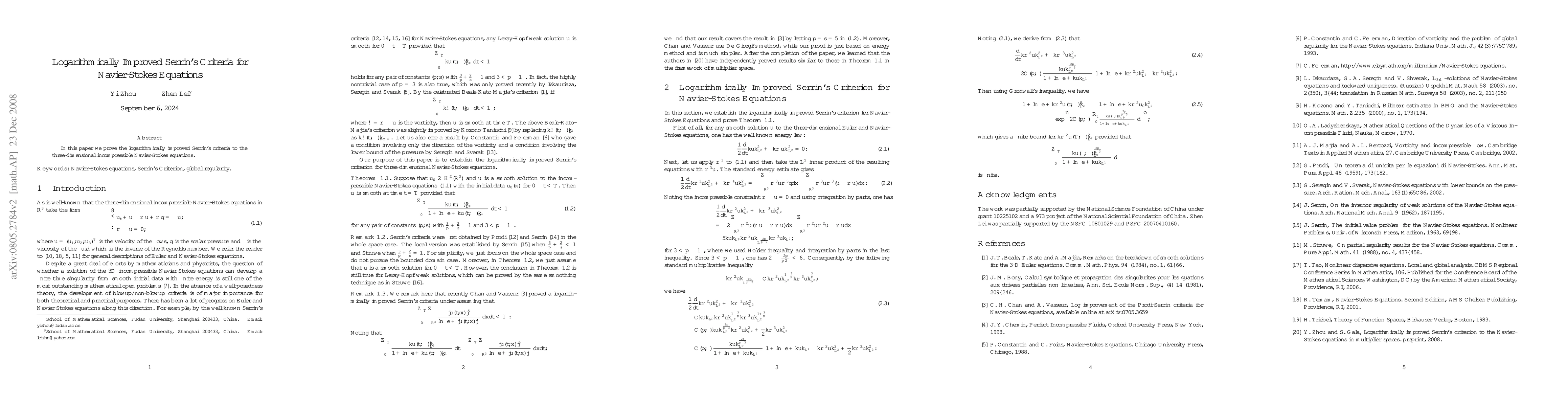 Summary: This paper establishes a logarithmically enhanced version of Serrin's criteria for the existence of solutions to the three-dimensional incompressible Navier-Stokes equations, contributing to the understanding of fluid dynamics.