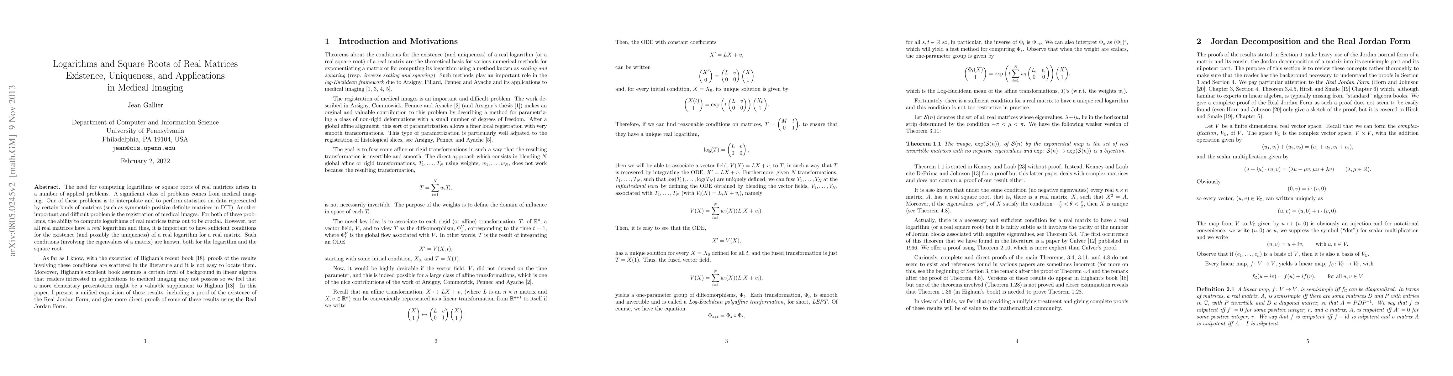 In these notes, we consider the problem of finding the logarithm or the square root of a real matrix. It is known that for every real n x n matrix, A, if no real eigenvalue of A is negative or zero, then A has a real logarithm, that is, there is a real matrix, X, such that e^X = A. Furthermore, if the eigenvalues, xi, of X satisfy the property -pi < Im(xi) < pi, then X is unique. It is also known that under the same condition every real n x n matrix, A, has a real square root, that is, there is a real matrix, X, such that X^2 = A. Moreover, if the eigenvalues, rho e^{i theta}, of X satisfy the condition -pi/2 < theta < pi/2, then X is unique. These theorems are the theoretical basis for various numerical methods for exponentiating a matrix or for computing its logarithm using a method known as scaling and squaring (resp. inverse scaling and squaring). Such methods play an important role in the log-Euclidean framework due to Arsigny, Fillard, Pennec and Ayache and its applications to medical imaging. Actually, there is a necessary and sufficient condition for a real matrix to have a real logarithm (or a real square root) but it is fairly subtle as it involves the parity of the number of Jordan blocks associated with negative eigenvalues. As far as I know, with the exception of Higham's recent book, proofs of these results are scattered in the literature and it is not easy to locate them. Moreover, Higham's excellent book assumes a certain level of background in linear algebra that readers interested in the topics of this paper may not possess so we feel that a more elementary presentation might be a valuable supplement to Higham. In these notes, I present a unified exposition of these results and give more direct proofs of some of them using the Real Jordan Form.