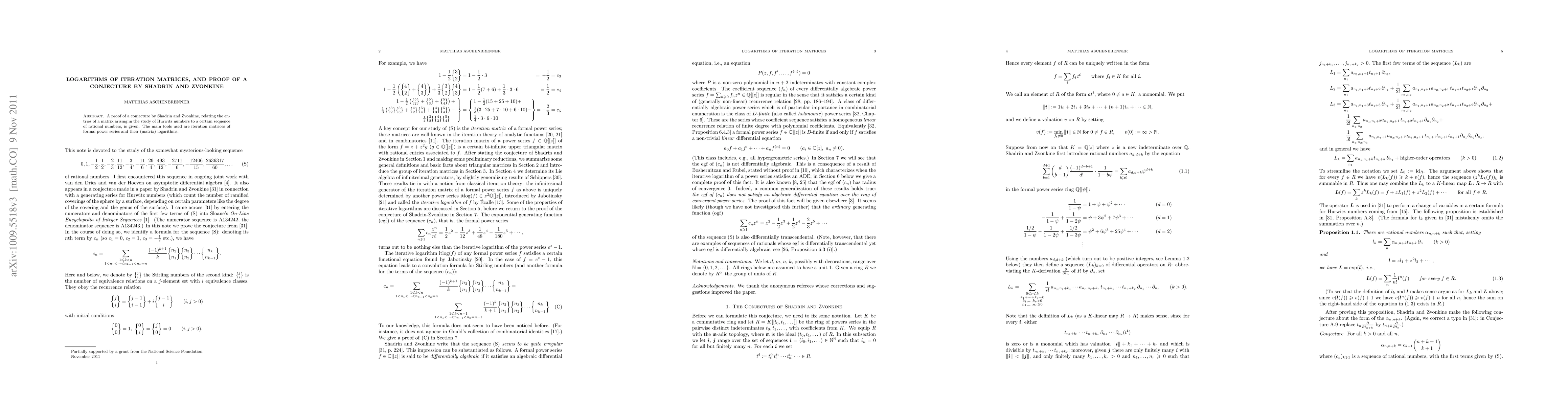 Summary: This paper proves a conjecture by Shadrin and Zvonkine linking matrix entries from Hurwitz numbers to a sequence of rational numbers, utilizing iteration matrices of formal power series and their logarithms as primary tools.