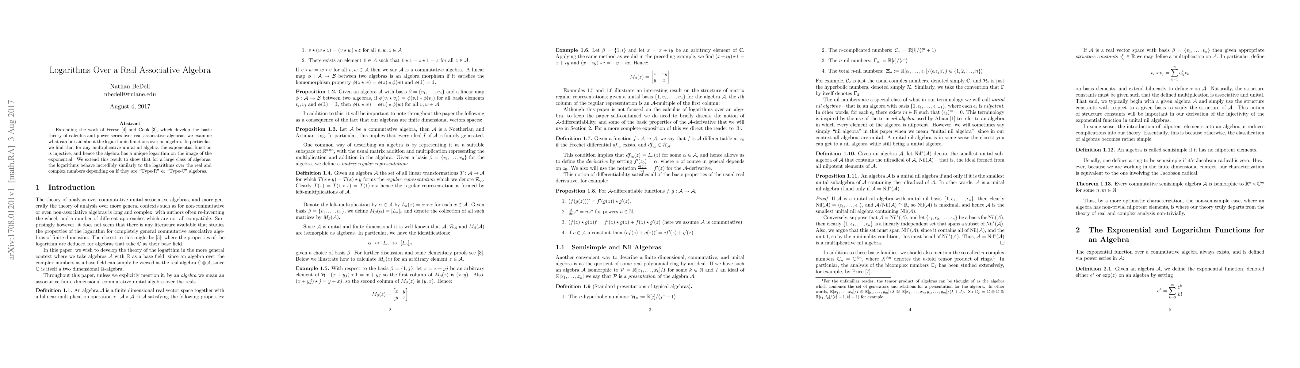 Extending the work of Freese and Cook, which develop the basic theory of calculus and power series over real associative algebras, we examine what can be said about the logarithmic functions over an algebra. In particular, we find that for any multiplicative unital nil algebra the exponential function is injective, and hence the algebra has a unique logarithm on the image of the exponential. We extend this result to show that for a large class of algebras, the logarithms behave incredibly similarly to the logarithms over the real and complex numbers depending on if they are "Type-R" or "Type-C" algebras.