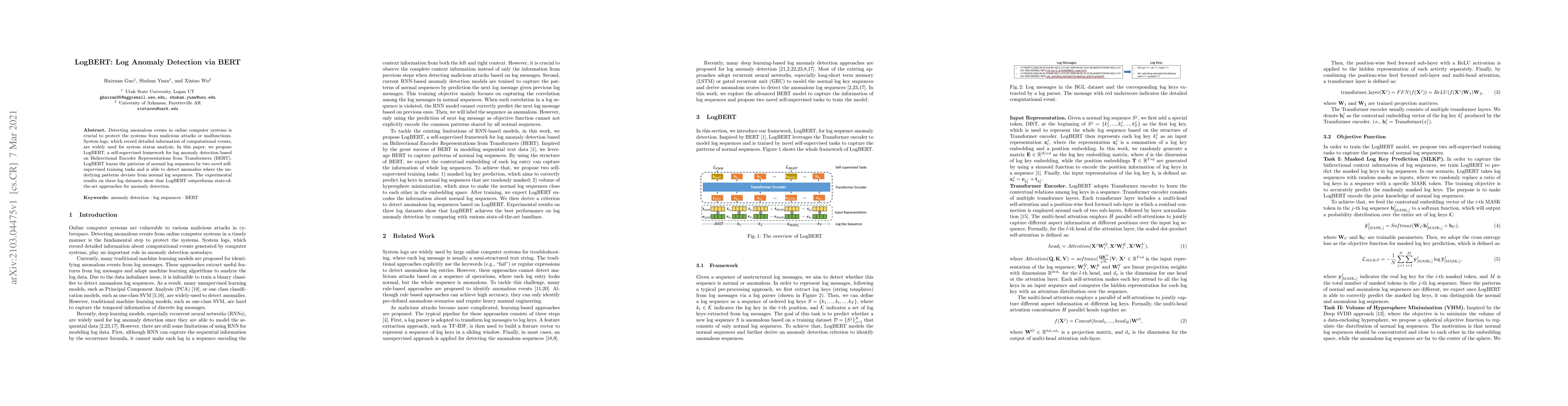 LogBERT is a self-supervised framework for log anomaly detection based on BERT, which learns normal log sequence patterns through two tasks: Masked Log Key Prediction (MLKP) and Volume of Hypersphere Minimization (VHM).