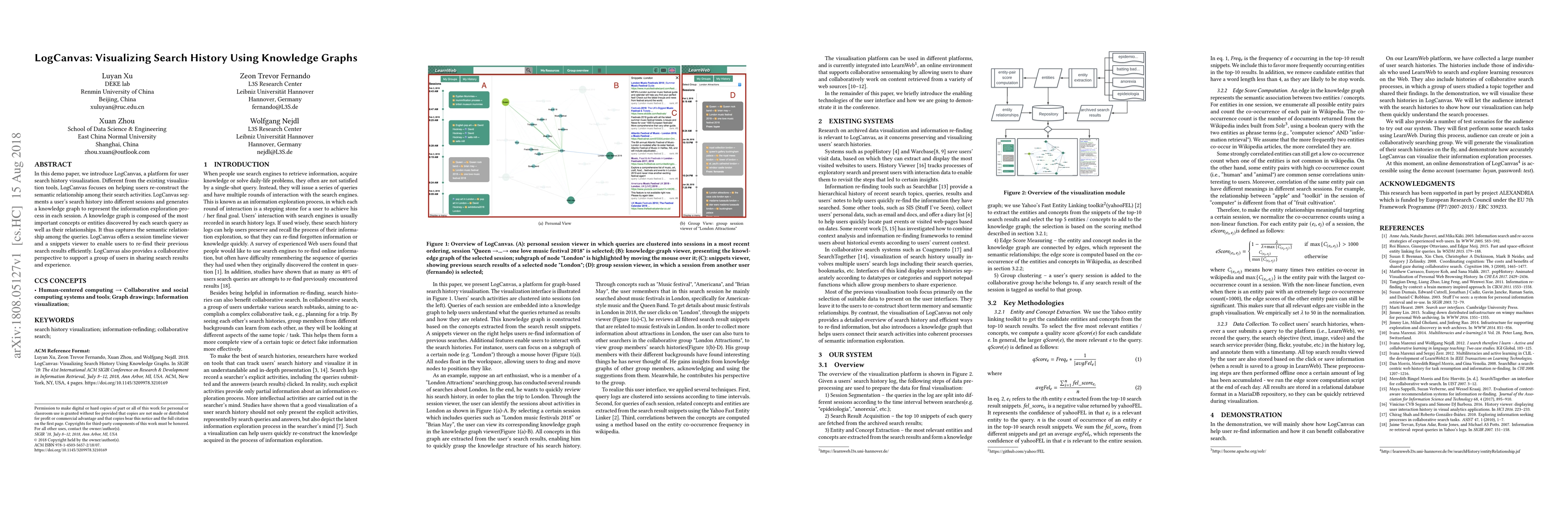 In this demo paper, we introduce LogCanvas, a platform for user search history visualisation. Different from the existing visualisation tools, LogCanvas focuses on helping users re-construct the semantic relationship among their search activities. LogCanvas segments a user's search history into different sessions and generates a knowledge graph to represent the information exploration process in each session. A knowledge graph is composed of the most important concepts or entities discovered by each search query as well as their relationships. It thus captures the semantic relationship among the queries. LogCanvas offers a session timeline viewer and a snippets viewer to enable users to re-find their previous search results efficiently. LogCanvas also provides a collaborative perspective to support a group of users in sharing search results and experience.
