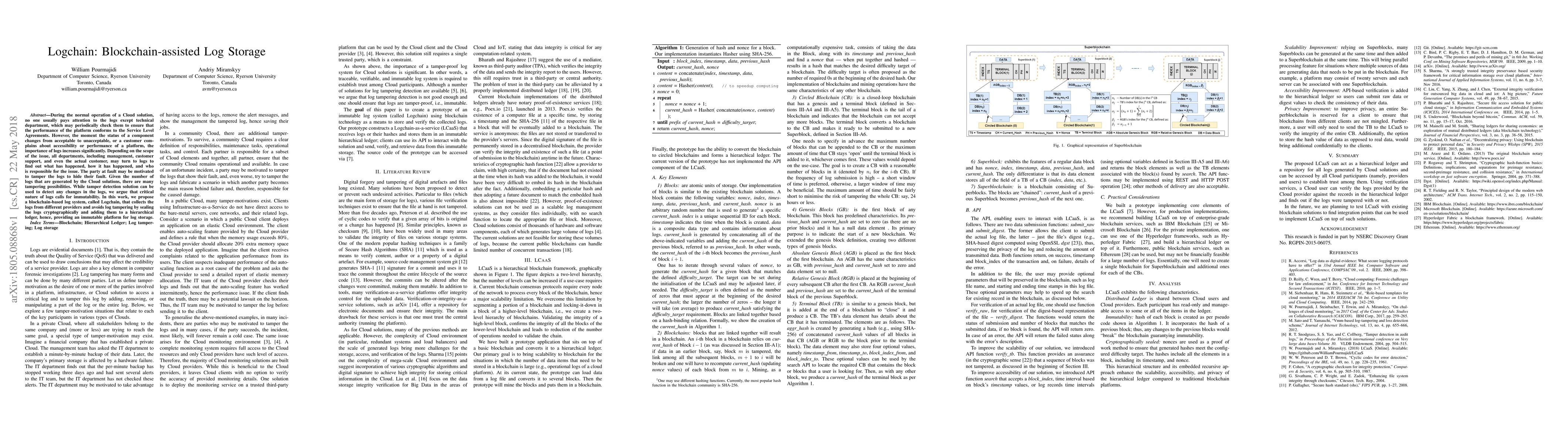 During the normal operation of a Cloud solution, no one usually pays attention to the logs except technical department, which may periodically check them to ensure that the performance of the platform conforms to the Service Level Agreements. However, the moment the status of a component changes from acceptable to unacceptable, or a customer complains about accessibility or performance of a platform, the importance of logs increases significantly. Depending on the scope of the issue, all departments, including management, customer support, and even the actual customer, may turn to logs to find out what has happened, how it has happened, and who is responsible for the issue. The party at fault may be motivated to tamper the logs to hide their fault. Given the number of logs that are generated by the Cloud solutions, there are many tampering possibilities. While tamper detection solution can be used to detect any changes in the logs, we argue that critical nature of logs calls for immutability. In this work, we propose a blockchain-based log system, called Logchain, that collects the logs from different providers and avoids log tampering by sealing the logs cryptographically and adding them to a hierarchical ledger, hence, providing an immutable platform for log storage.