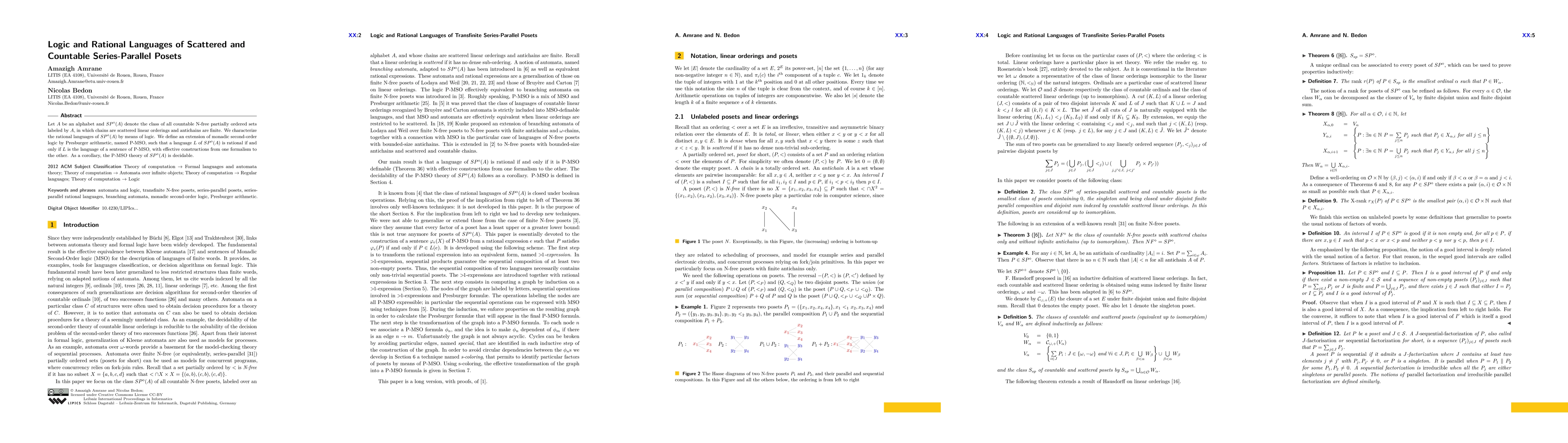 This paper characterizes the rational languages of countable, series-parallel posets using an extended monadic second-order logic with Presburger arithmetic, proving their decidability and providing effective translations between logic and languages.