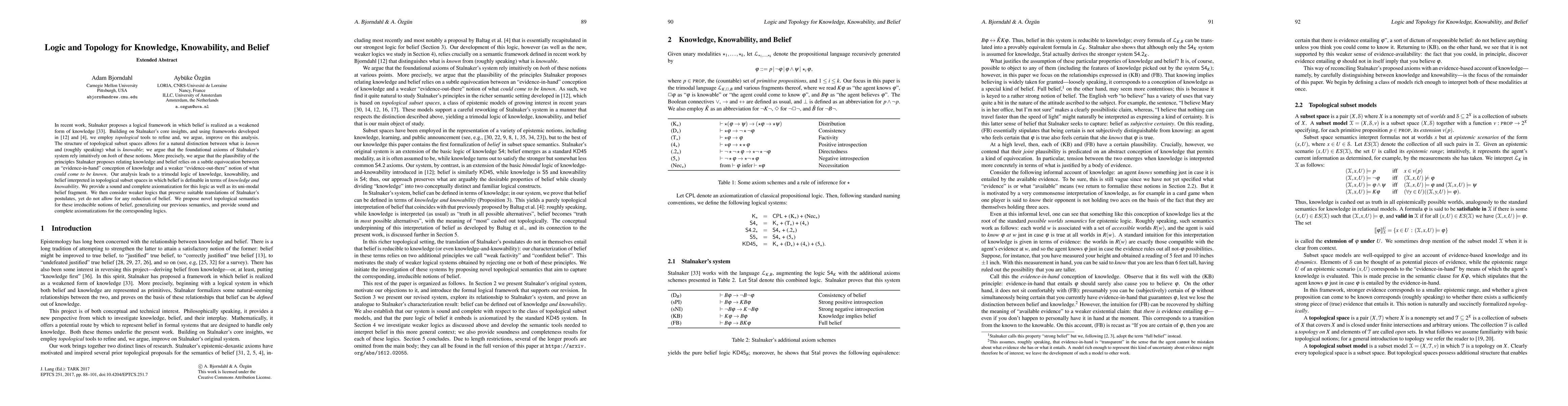 In recent work, Stalnaker proposes a logical framework in which belief is realized as a weakened form of knowledge. Building on Stalnaker's core insights, and using frameworks developed by Bjorndahl and Baltag et al., we employ topological tools to refine and, we argue, improve on this analysis. The structure of topological subset spaces allows for a natural distinction between what is known and (roughly speaking) what is knowable; we argue that the foundational axioms of Stalnaker's system rely intuitively on both of these notions. More precisely, we argue that the plausibility of the principles Stalnaker proposes relating knowledge and belief relies on a subtle equivocation between an "evidence-in-hand" conception of knowledge and a weaker "evidence-out-there" notion of what could come to be known. Our analysis leads to a trimodal logic of knowledge, knowability, and belief interpreted in topological subset spaces in which belief is definable in terms of knowledge and knowability. We provide a sound and complete axiomatization for this logic as well as its uni-modal belief fragment. We then consider weaker logics that preserve suitable translations of Stalnaker's postulates, yet do not allow for any reduction of belief. We propose novel topological semantics for these irreducible notions of belief, generalizing our previous semantics, and provide sound and complete axiomatizations for the corresponding logics.