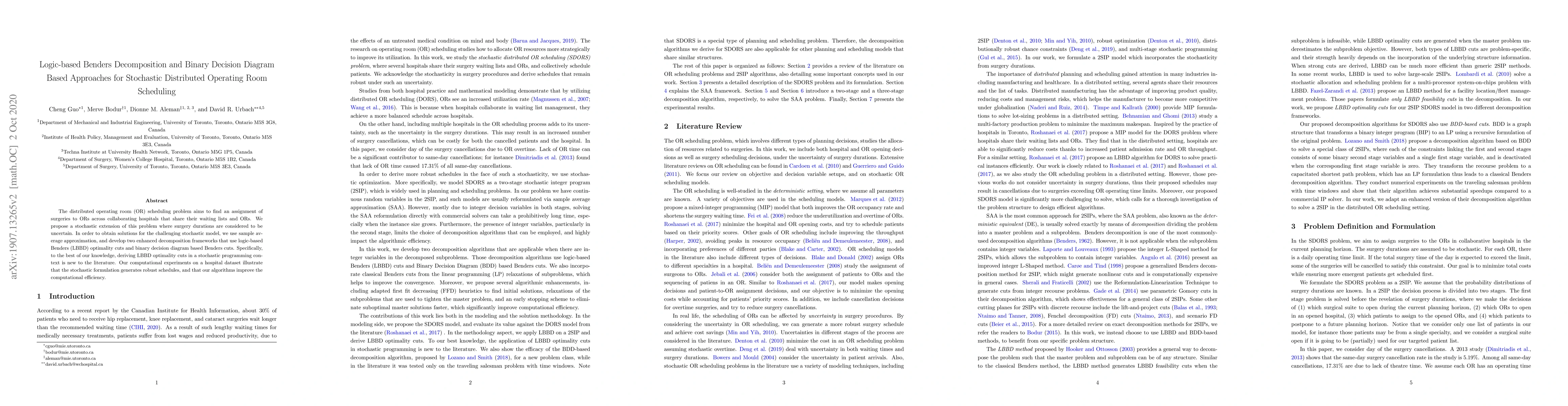 This paper proposes a stochastic model for distributed operating room scheduling with uncertain surgery durations, employing logic-based Benders decomposition and binary decision diagram based Benders cuts. Computational results show that the proposed stochastic formulation and algorithms generate robust schedules and improve computational efficiency.