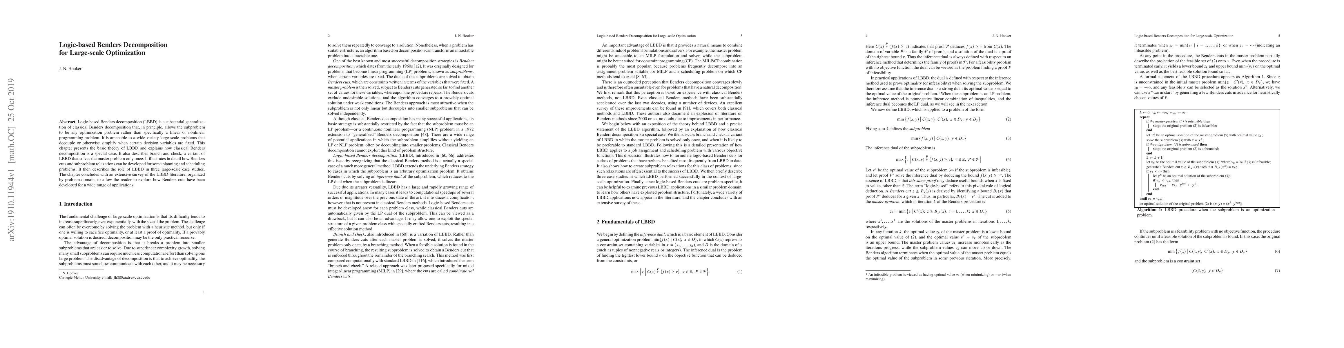 Logic-based Benders decomposition (LBBD) generalizes classical Benders decomposition to handle any optimization subproblem, facilitating large-scale problem simplification. This method is illustrated through planning and scheduling examples and applied in three case studies, with a comprehensive literature survey by problem domain.